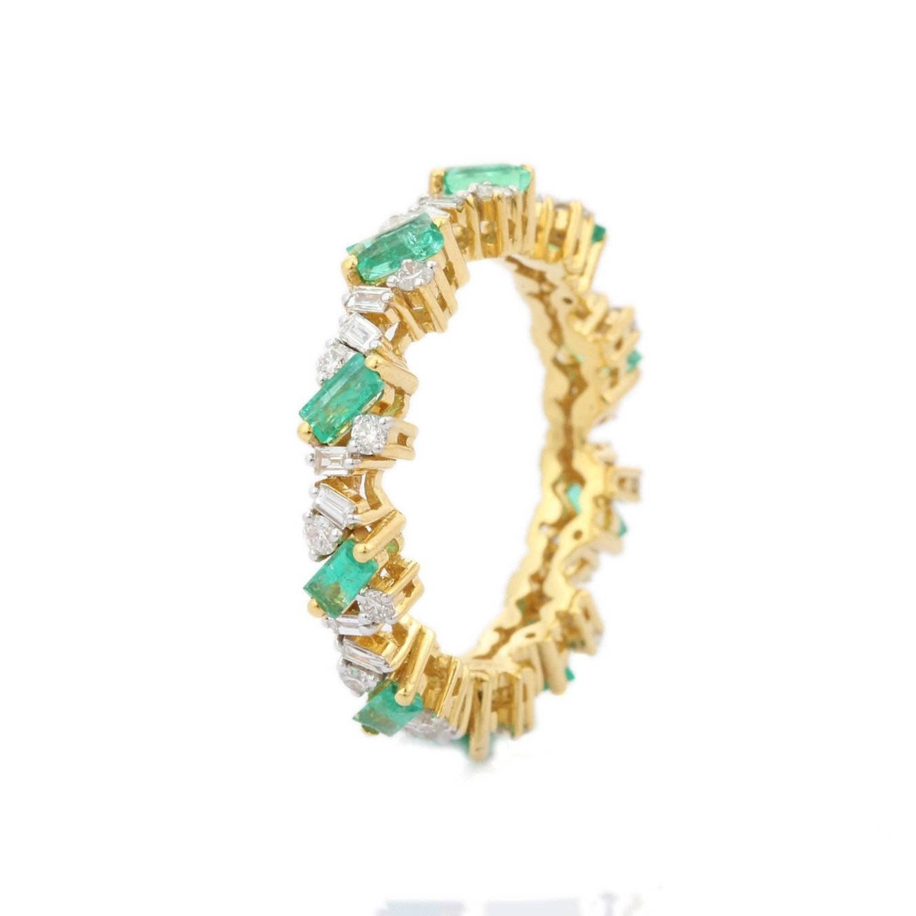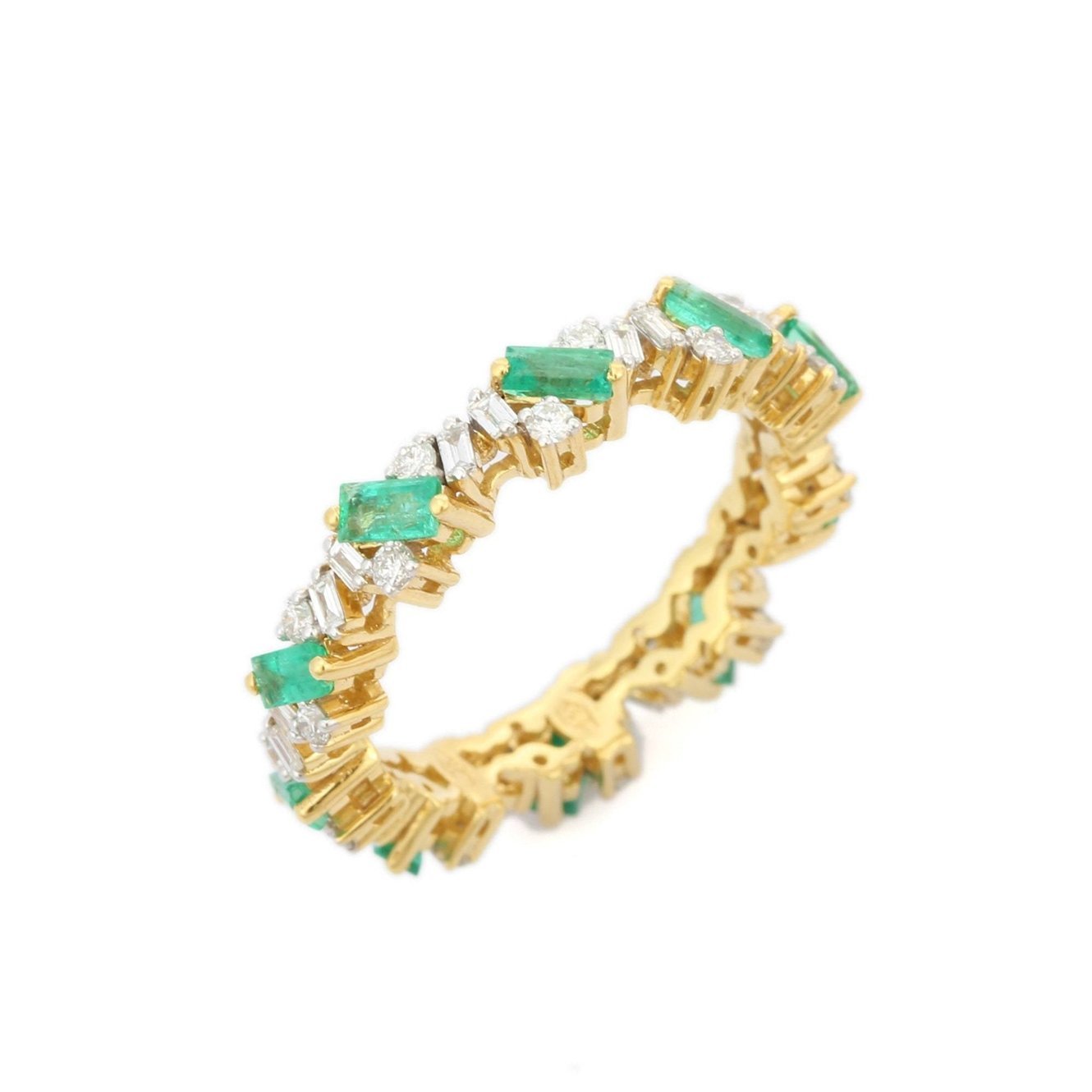 At the center of this stunning ring are nine baguette-cut emeralds, totaling 0.88 carats. Each emerald measures 4 x 2 mm, showcasing a rich green hue that symbolizes renewal and growth. The baguette cut enhances the emeralds’ natural clarity and brilliance, allowing them to catch the light beautifully from every angle.