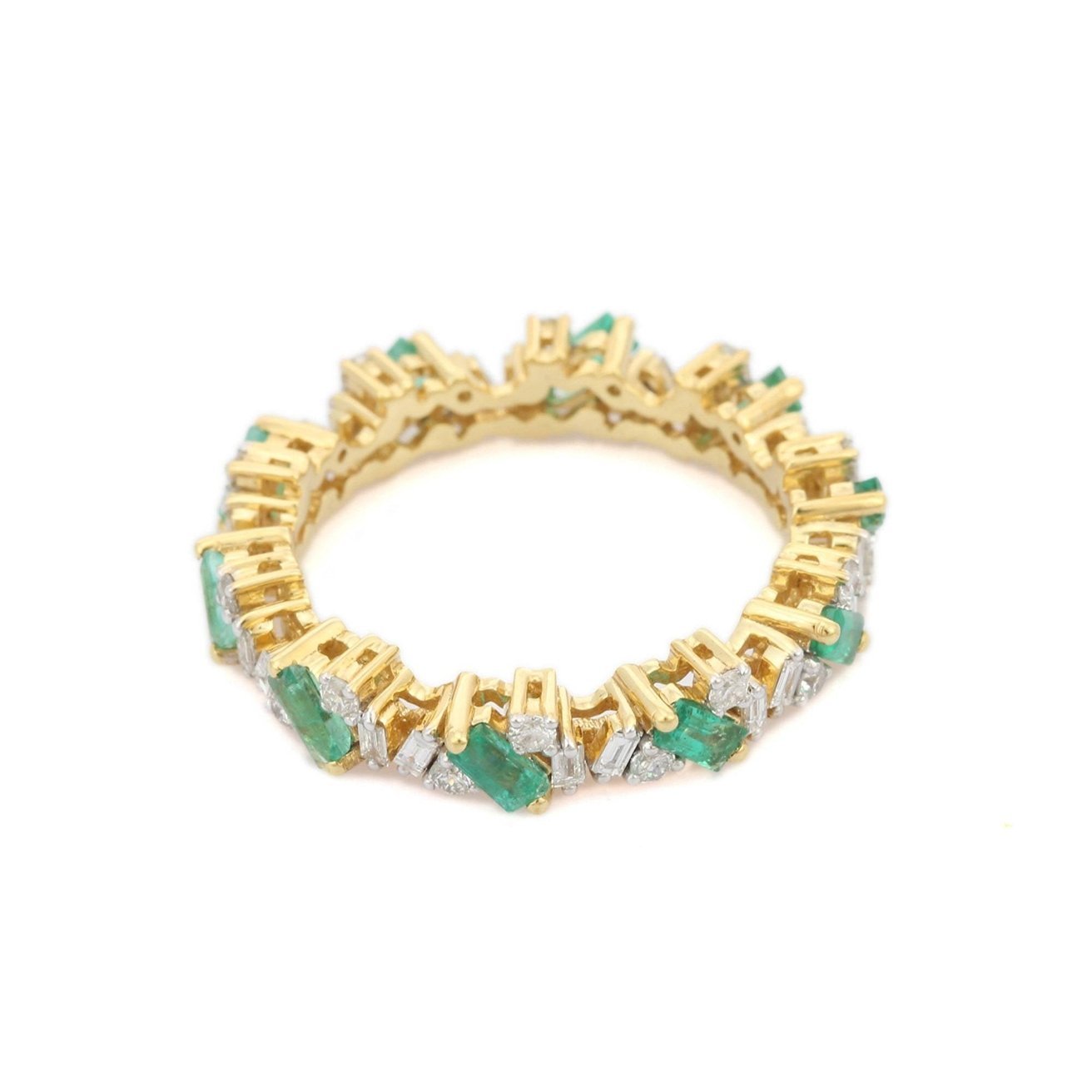 The band of the ring, made from 18k yellow gold, provides a warm and luxurious backdrop for the emeralds and diamonds. The gold band is polished to a high shine, adding to the ring’s overall allure. With a comfortable fit and a sturdy design, this ring is perfect for daily wear or special occasions.
