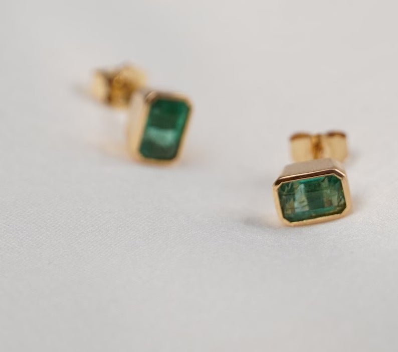 Each emerald is securely set in a bezel setting, which not only protects the gemstones but also enhances their brilliance and color. The bezel setting provides a modern and sleek look, allowing the emeralds to take center stage. The design of these stud earrings is both elegant and contemporary, making them a versatile accessory that can be worn for any occasion, from casual outings to formal events.