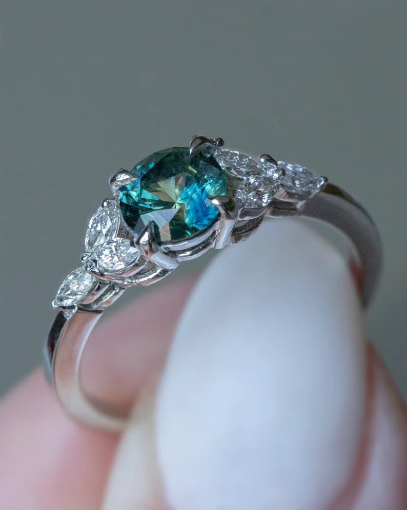 A 1-1.2 ct natural Montana sapphire ring, accented with six marquise diamonds, set in 18k solid gold. A timeless and nature-inspired treasure.
