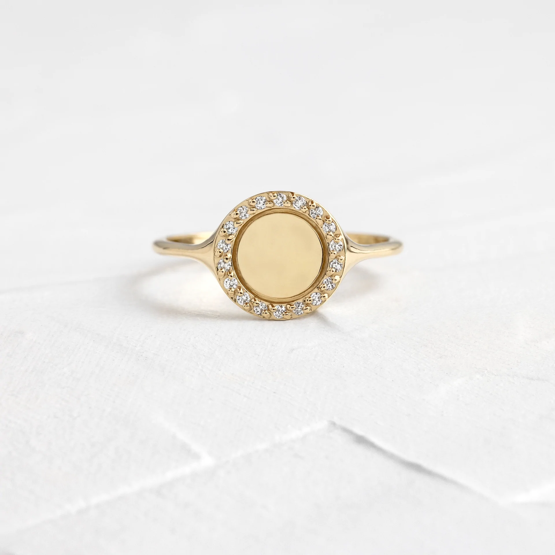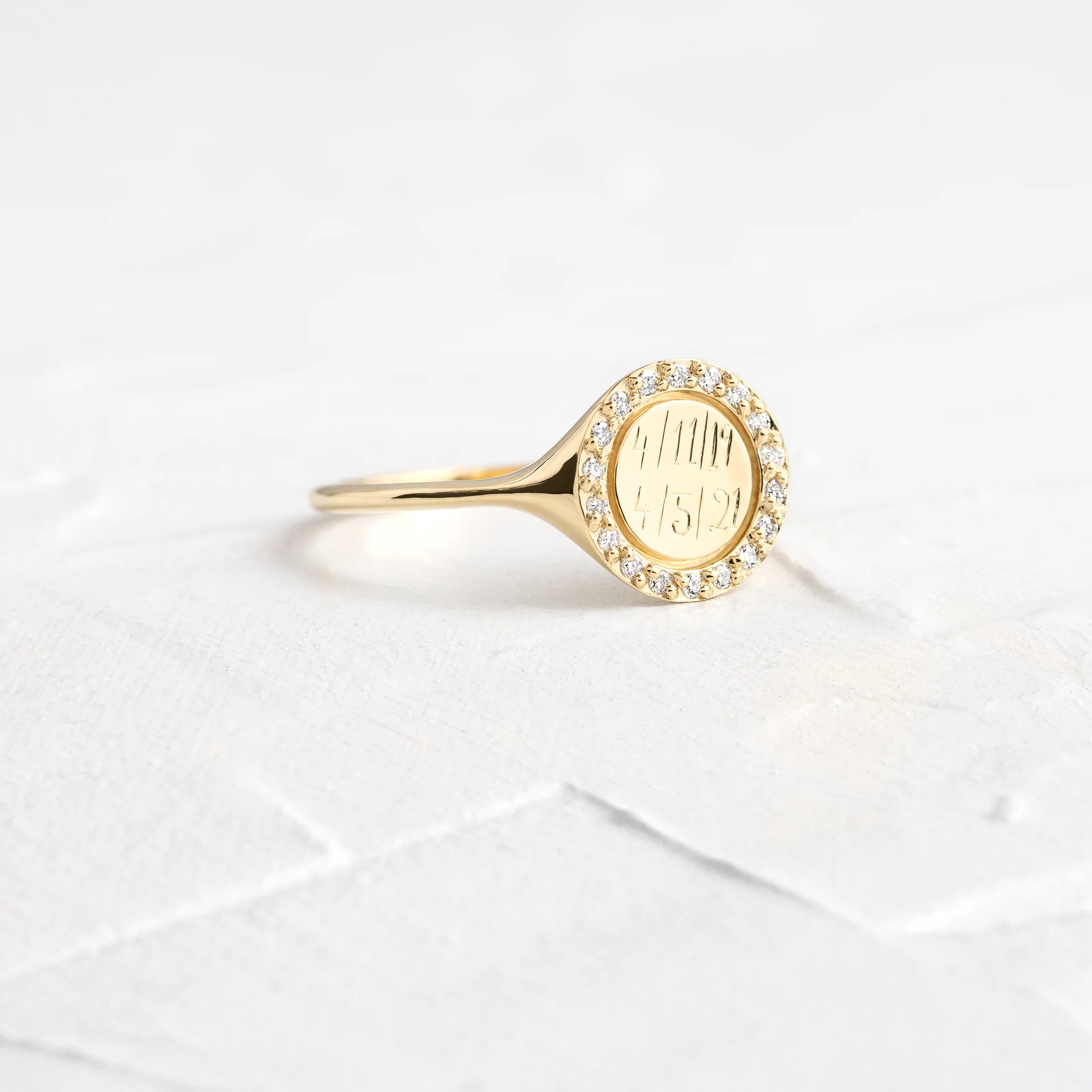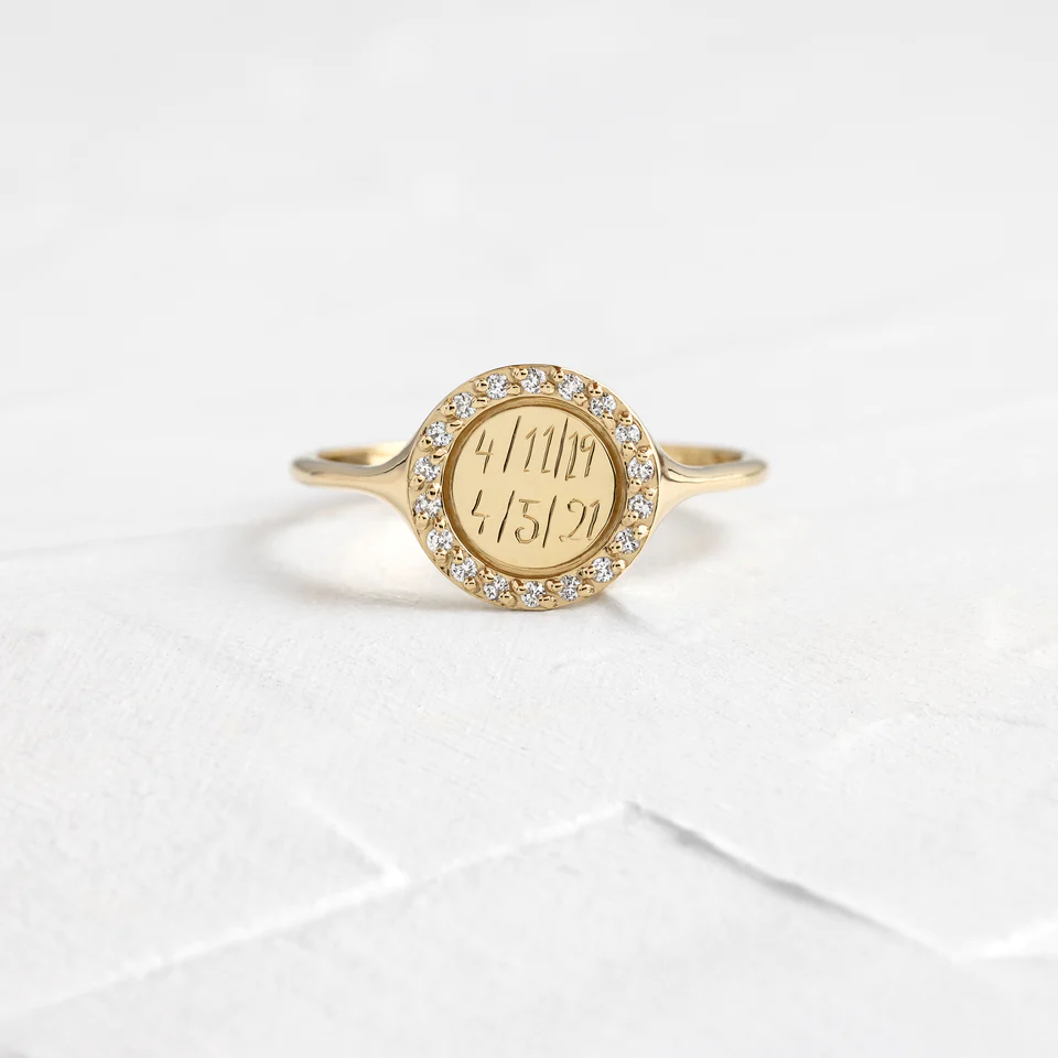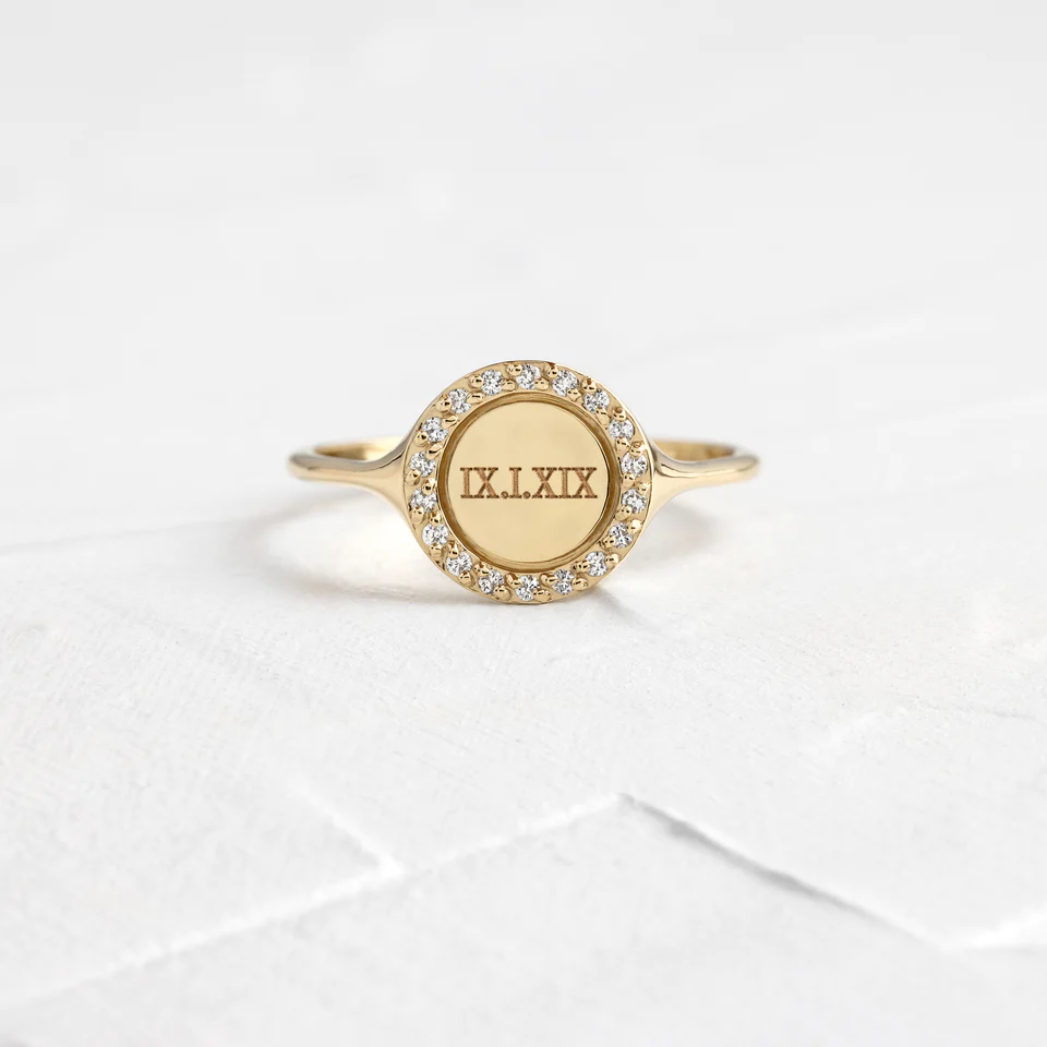 The 18k Solid Gold Lab-Grown Diamond Emblem Signet Ring is bold and classy, perfect for those who appreciate modern luxury with a classic twist.