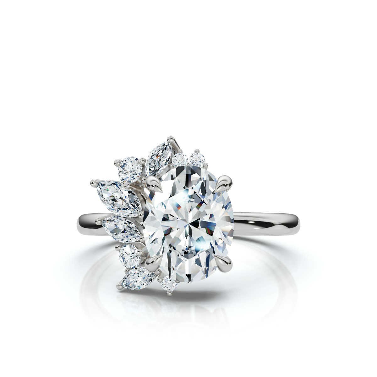 A 2ct oval Moissanite diamond engagement ring in 18k solid gold, featuring 0.36ct of round and marquise diamonds for a sophisticated and timeless look.