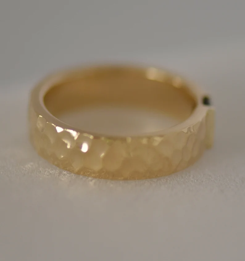 Bold 18k solid gold men’s wedding band with a hammered finish and green sapphire—crafted for rugged elegance and timeless individuality.