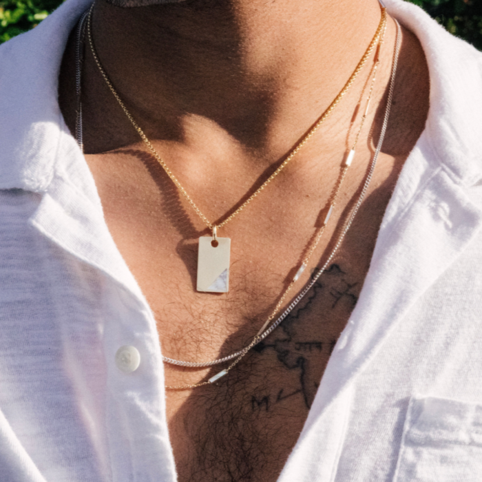 Introducing the 18k Solid Gold Multi Mother of Pearl Rectangle Necklace, a beautifully crafted piece that combines classic elegance with modern design. This exquisite necklace features a 24-inch chain made from premium 18k Solid Gold, offering a luxurious look and feel. The centerpiece of this necklace is a series of rectangular pendants, each inlaid with lustrous Mother of Pearl. These inlays capture the light beautifully, showcasing their natural iridescence and creating a stunning visual effect.