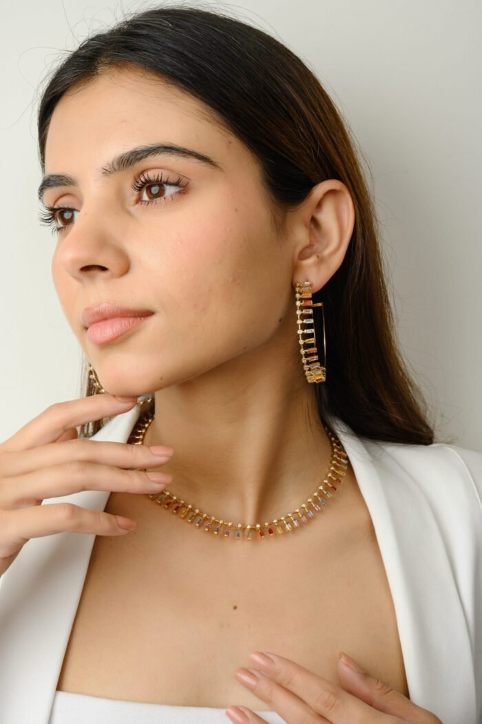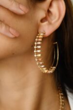 Measuring 51.6 mm in length and 9.1 mm in width, these big hoop earrings are designed to make a statement. Despite their bold appearance, they are lightweight and comfortable, weighing 16.06 grams, making them ideal for special occasions or adding a touch of luxury to everyday wear. The secure half bezel setting ensures that the gemstones remain the focal point, allowing their beauty to shine through.