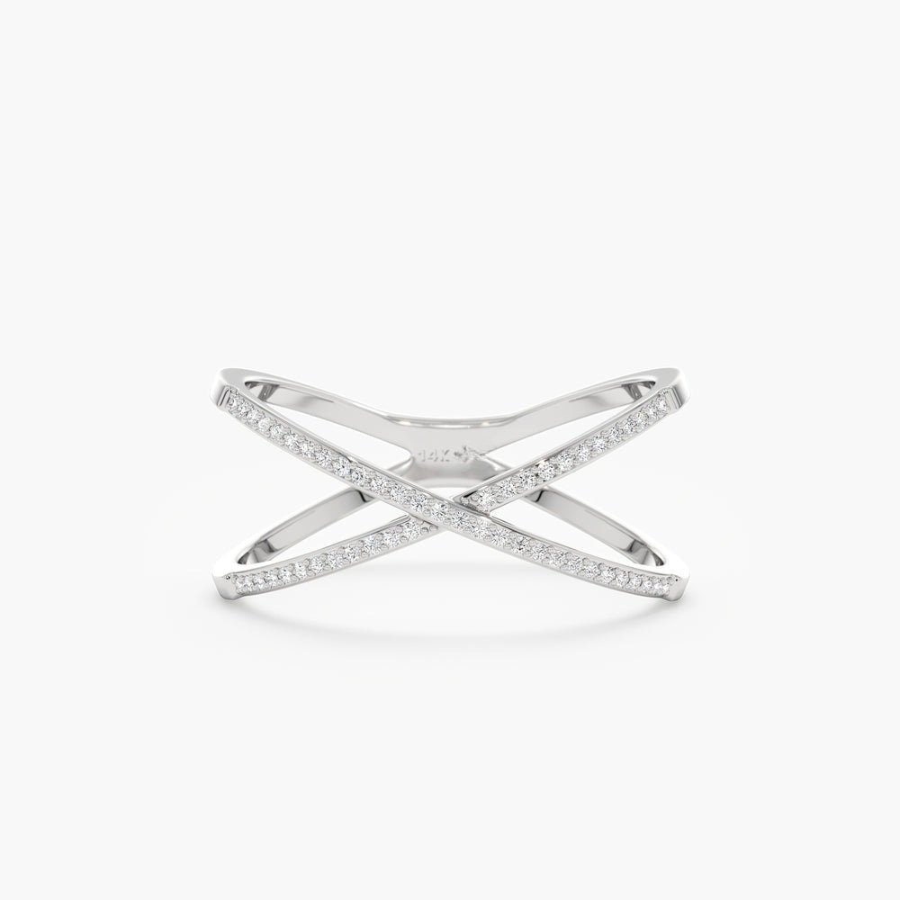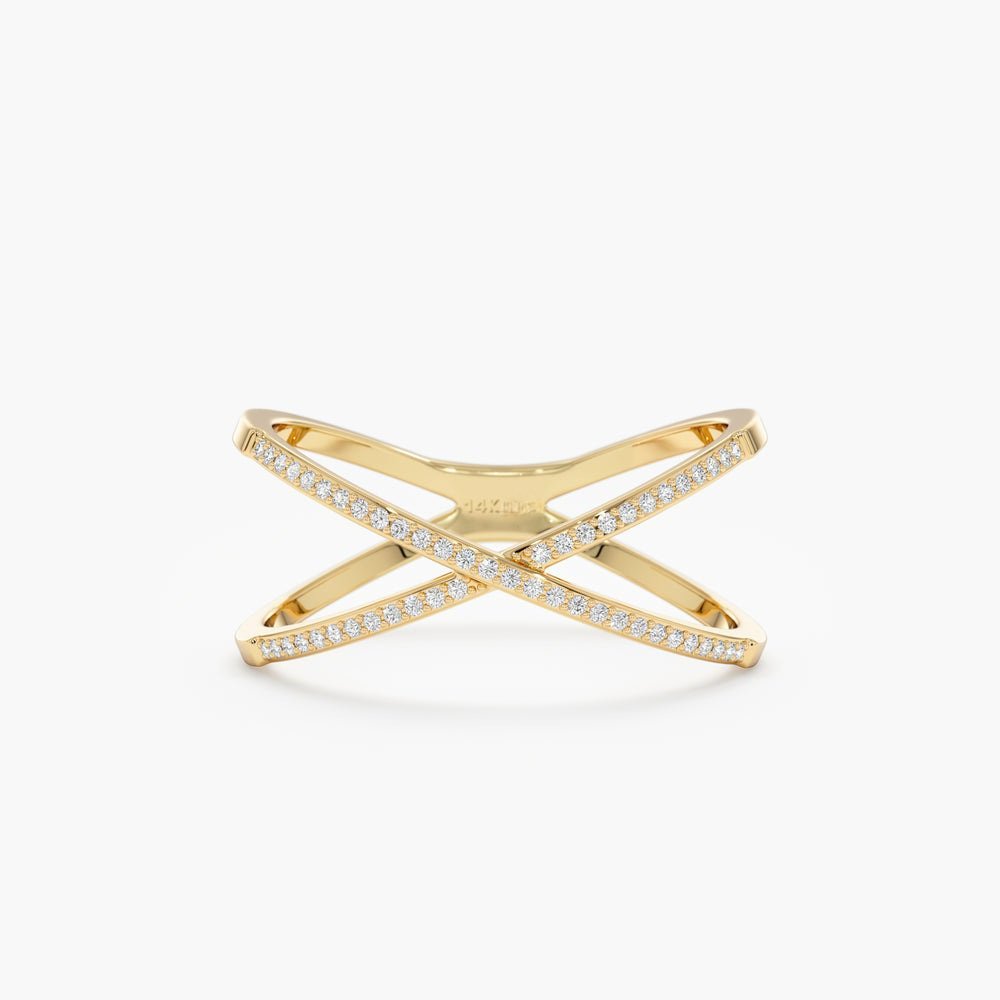 Striking 18k gold X ring with 0.22 ct GH/VS-SI natural diamonds. Bold crossover design, 9 mm wide. GIA certified, BIS hallmarked.