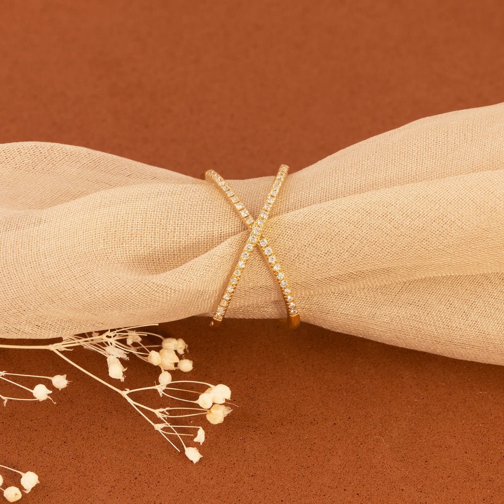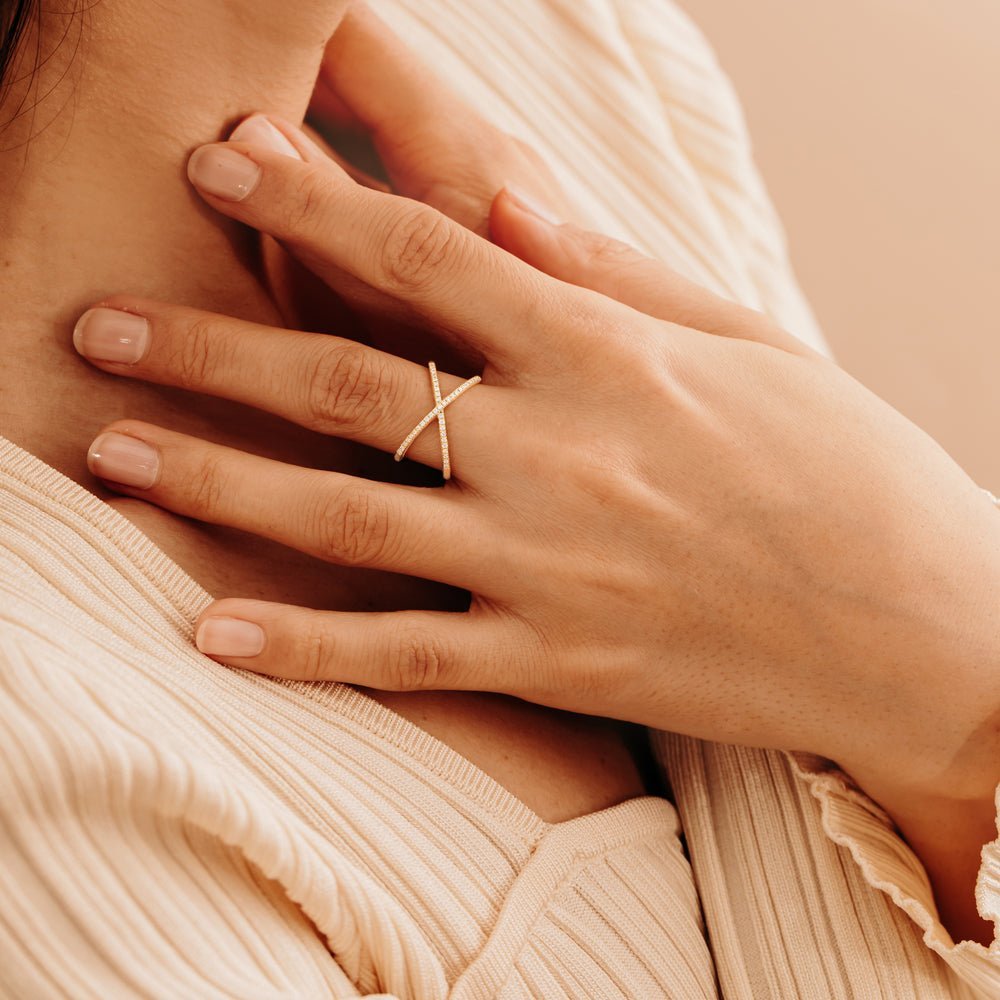 The intersecting gold bands offer a sculptural quality, creating an open framework that wraps delicately yet confidently around the finger. Designed to dazzle on its own or complement other stackable, this ring is perfect for the style-savvy woman who embraces contemporary design with timeless sparkle. Whether gifted as a celebration piece or worn as a symbol of self-expression, the X Ring stands out with intentional elegance.