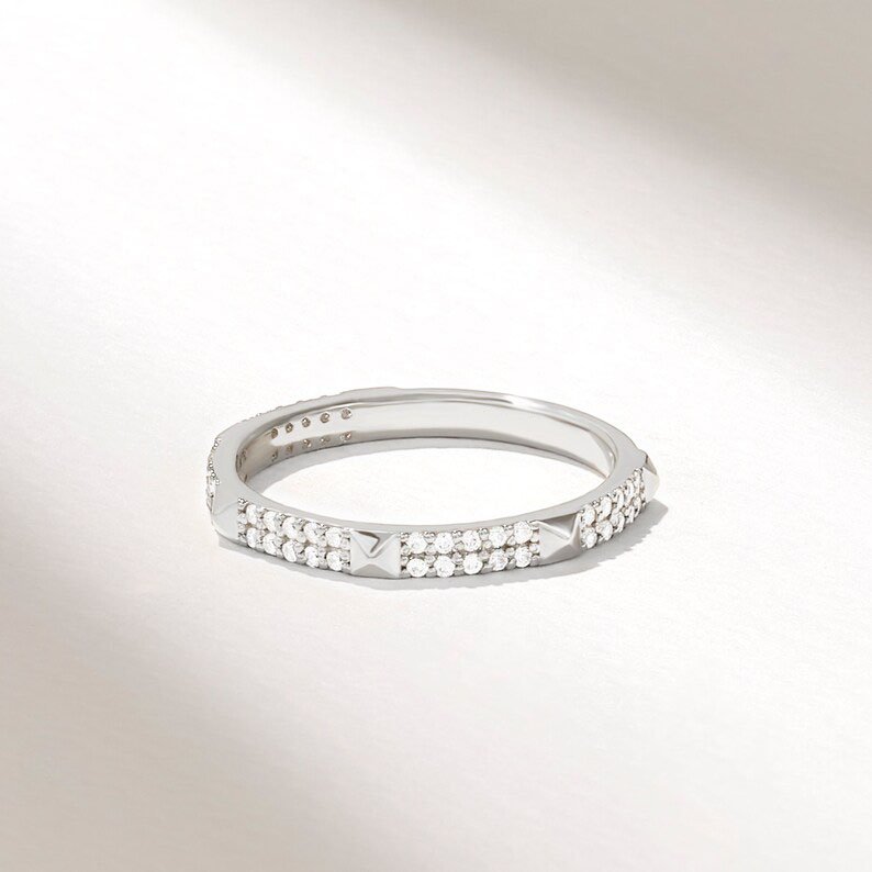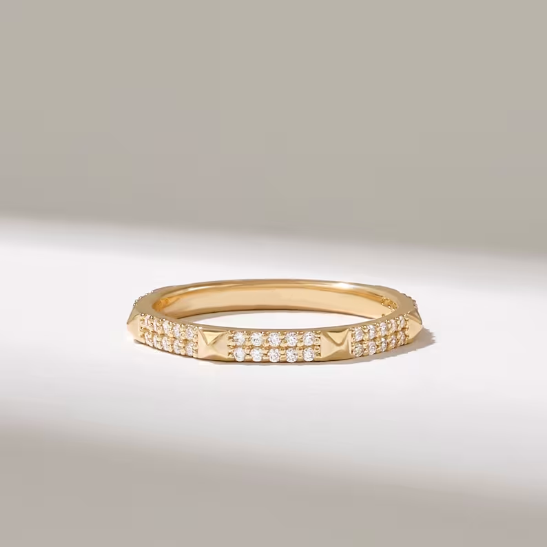 The ring’s sleek form, with a band width of 2.15MM and a thickness of 1.25MM, makes it a comfortable, stackable piece that can be worn alone for minimalist elegance or layered with other rings for a bolder expression. Available in White, Yellow, or Rose Gold, its pyramid-inspired shape adds a geometric twist to classic diamond jewelry.
