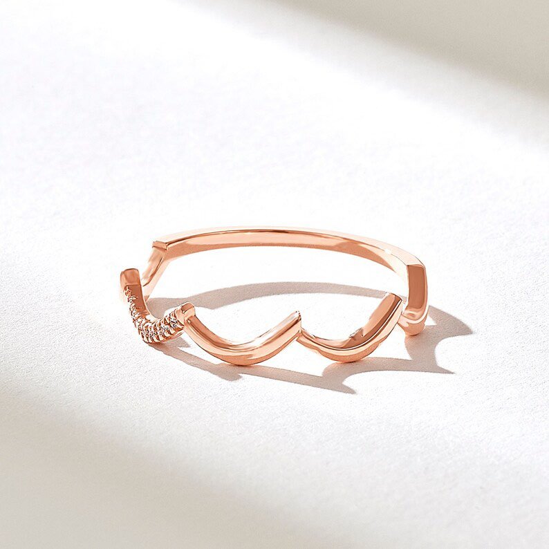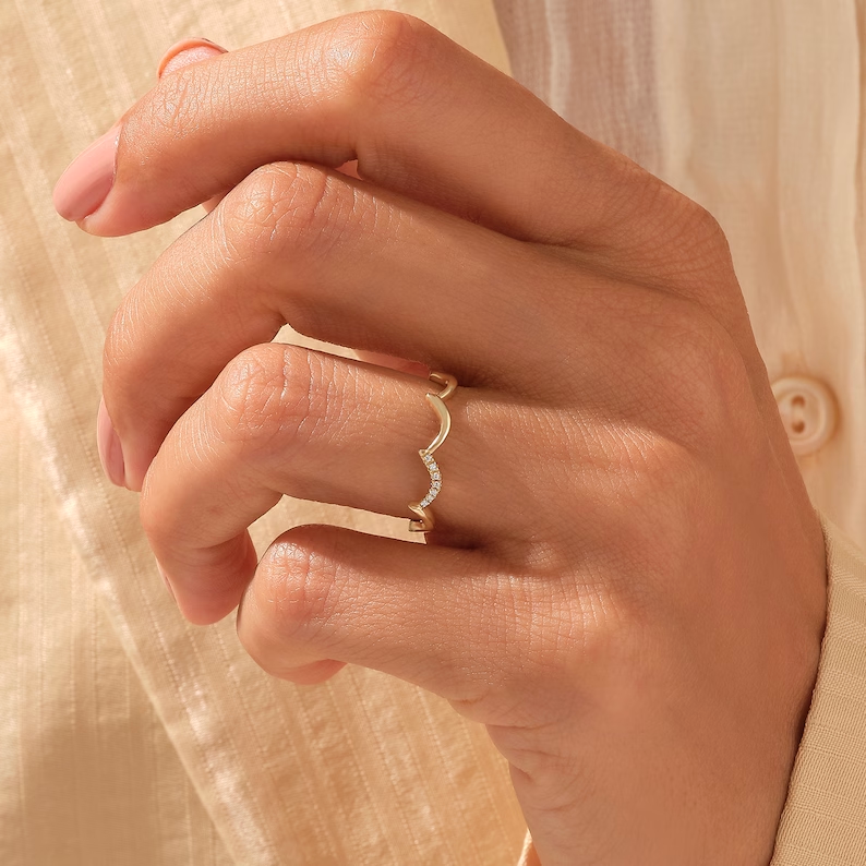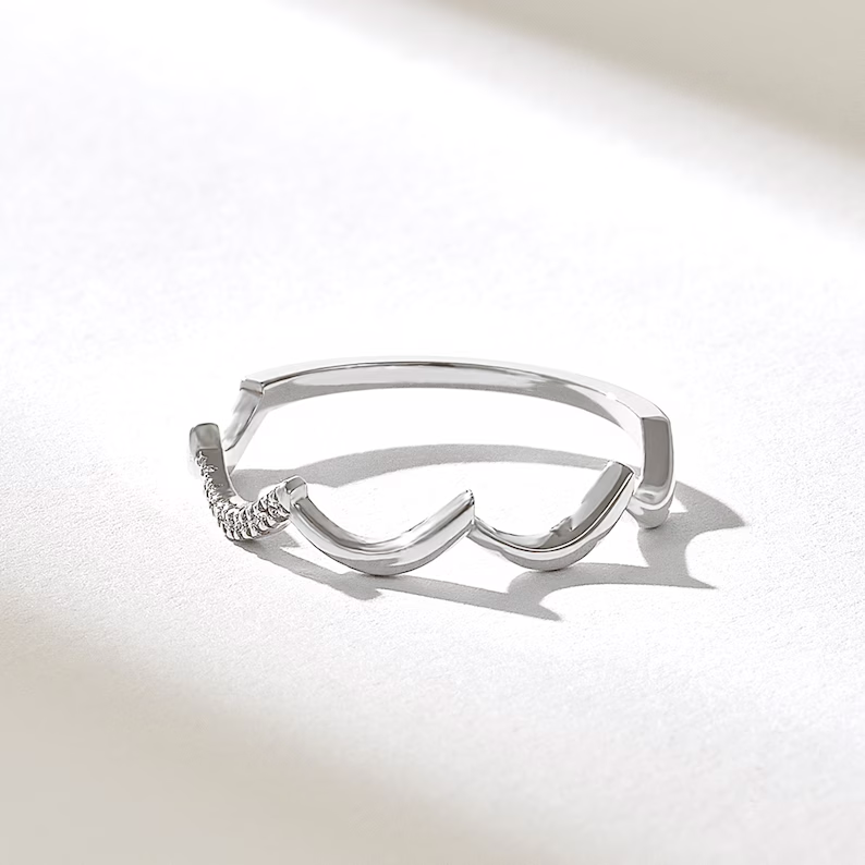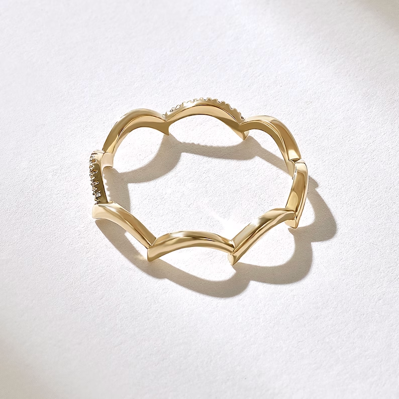 The unique zigzag pattern at the top of the ring measures 3.63 mm wide and gives the band a bold yet refined look. The body of the band is delicately slim at 1.20 mm wide and 1.08 mm thick, making it lightweight and comfortable for everyday wear while still standing out in a ring stack.