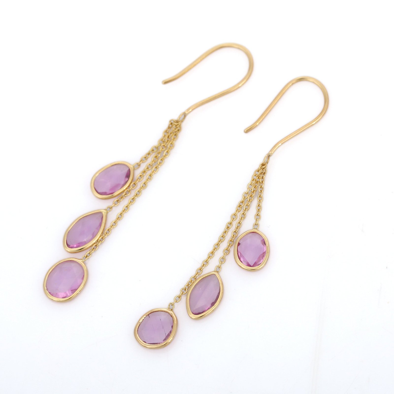 Elegant 18k solid gold dangle earrings featuring vibrant pink sapphires—crafted for graceful movement, feminine charm, and timeless sparkle.