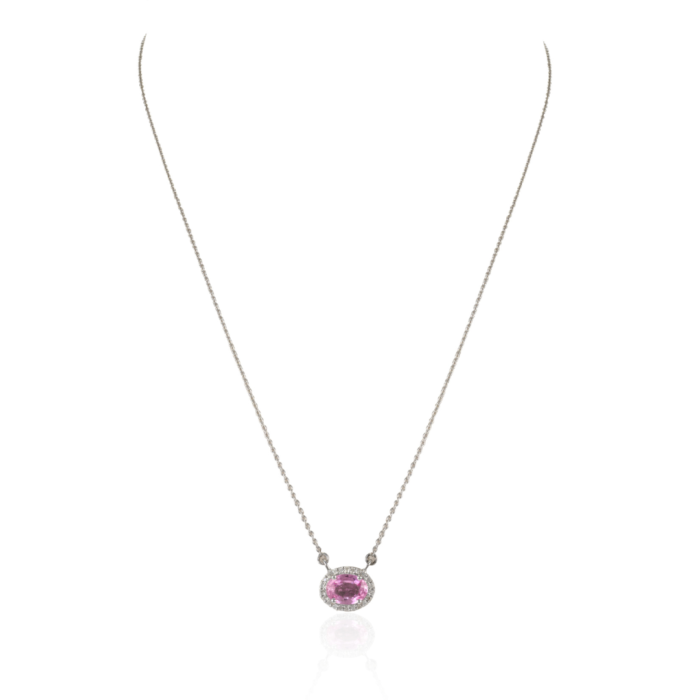 Weighing 1.8 grams, this pink sapphire and diamond necklace offers a lightweight yet luxurious feel, making it ideal for both everyday wear and special occasions. The elegant design ensures that the sapphire and diamonds remain the focal points, allowing their beauty to shine through. The prong setting provides a secure and stylish way to showcase the gemstones, enhancing the overall appeal of the pendant.