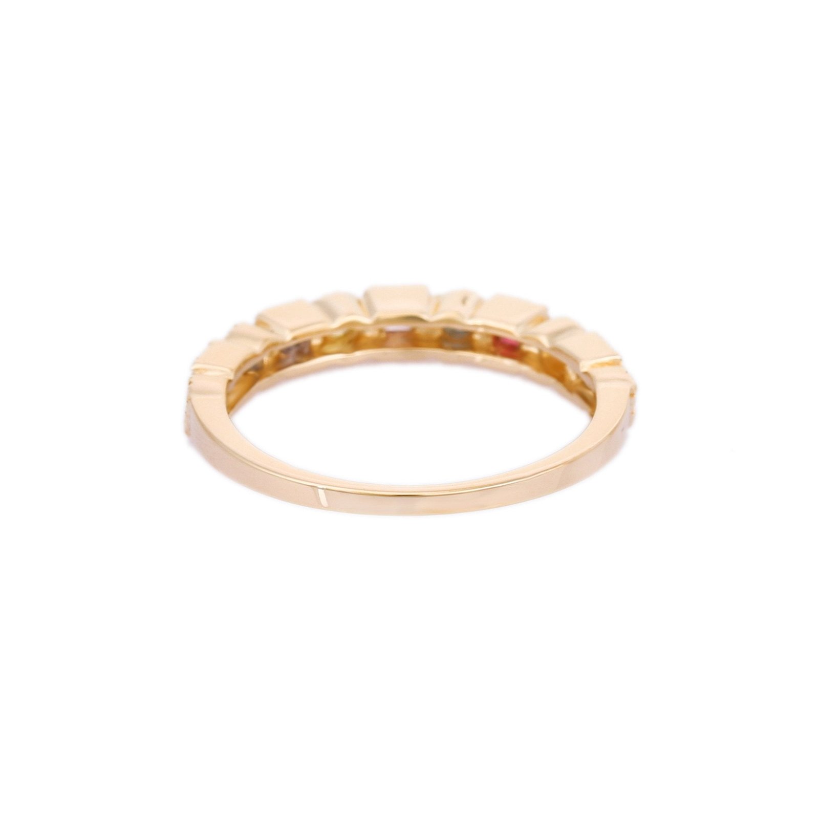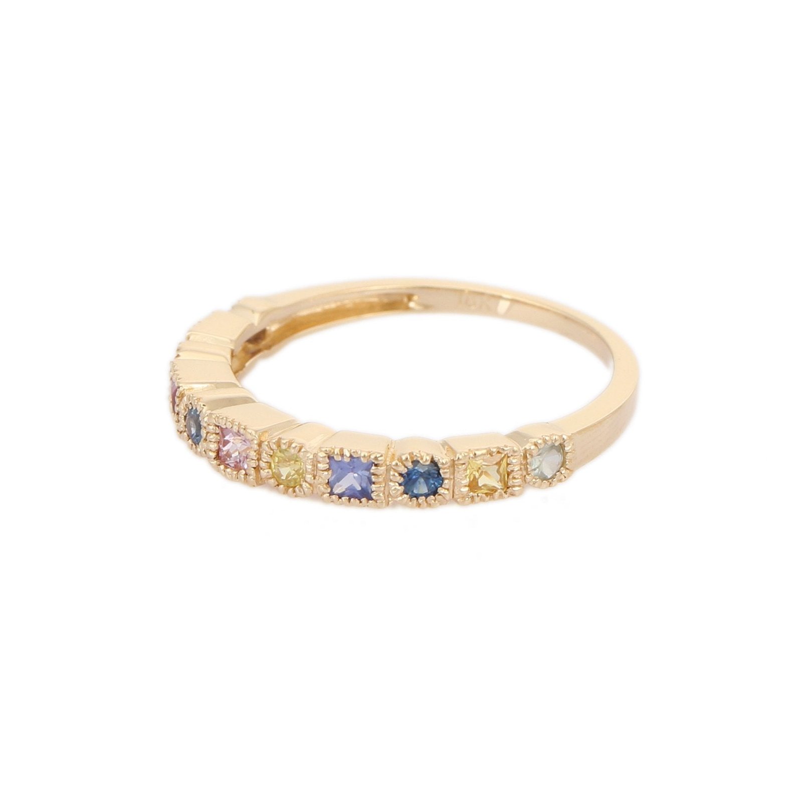 Elevate your style with the mesmerizing hues of the 18k Solid Gold Rainbow Sapphire Ring, expertly crafted from premium 18k solid gold. This charming ring features eleven round rainbow sapphires, each measuring 1.8 mm in size and collectively weighing 0.24 carats.