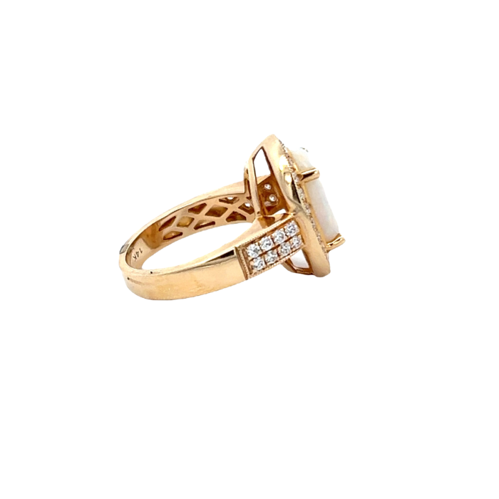 This ring features a stunning 3.37 CT opal that has a mesmerizing play of colors, making it a striking centerpiece.