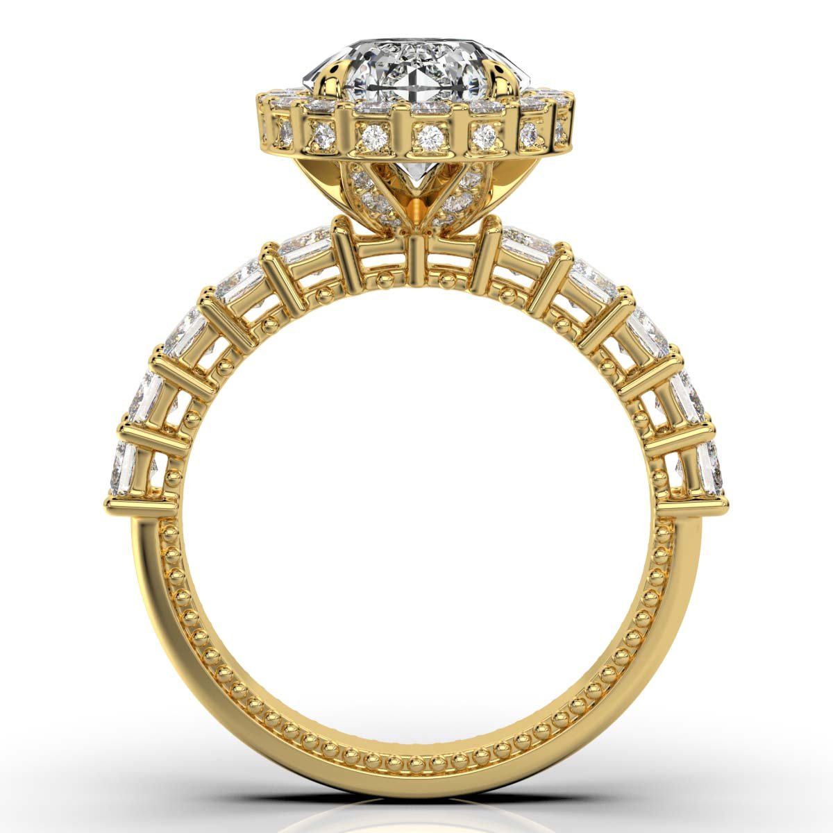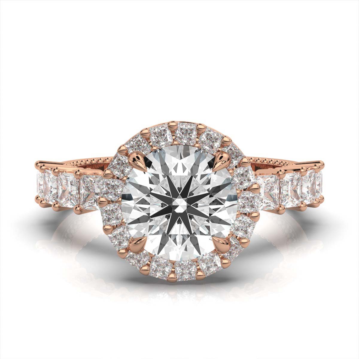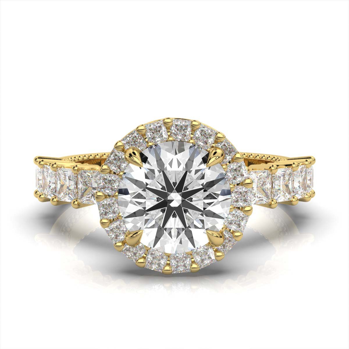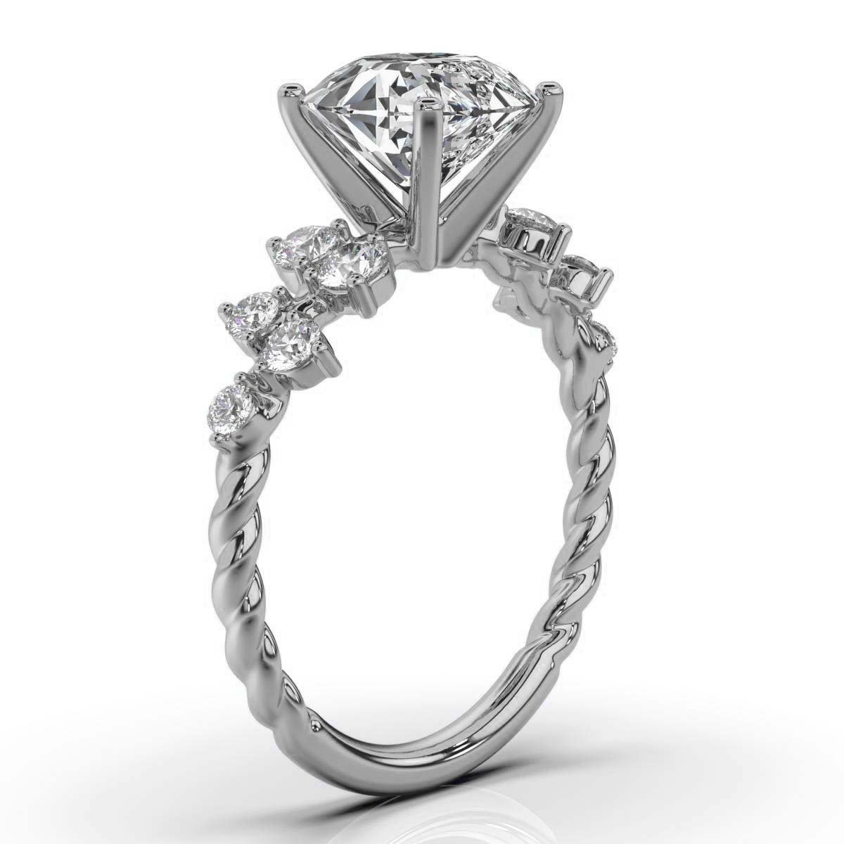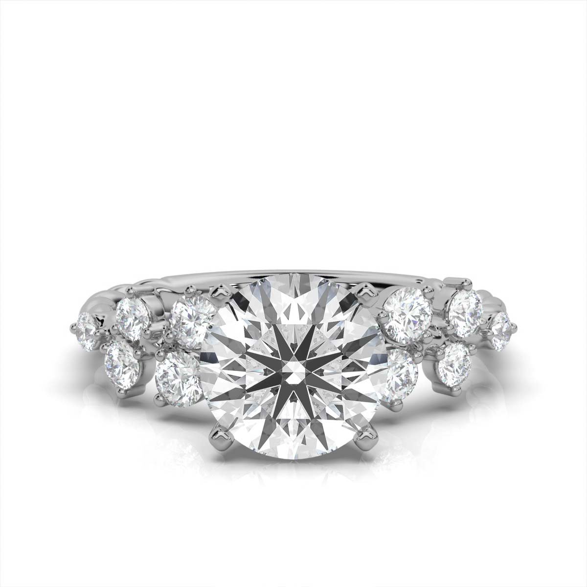 A 2 ct round moissanite diamond engagement ring with 10 sparkling side diamonds (0.36 ct total) set in 18k solid gold. Available in white, yellow, and rose gold.
