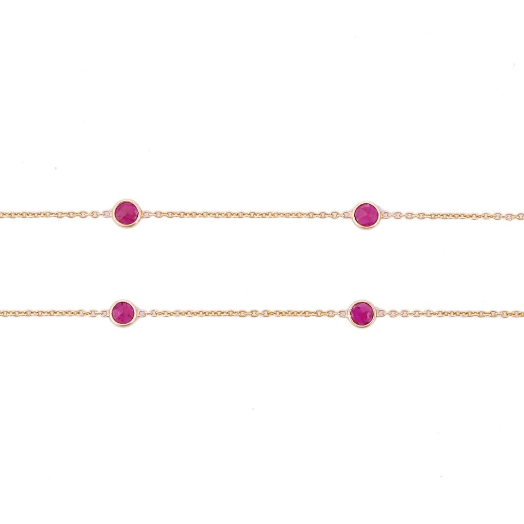 Refined 18k solid gold chain necklace adorned with vivid rubies. A timeless piece that adds a touch of passion and elegance to any look.
