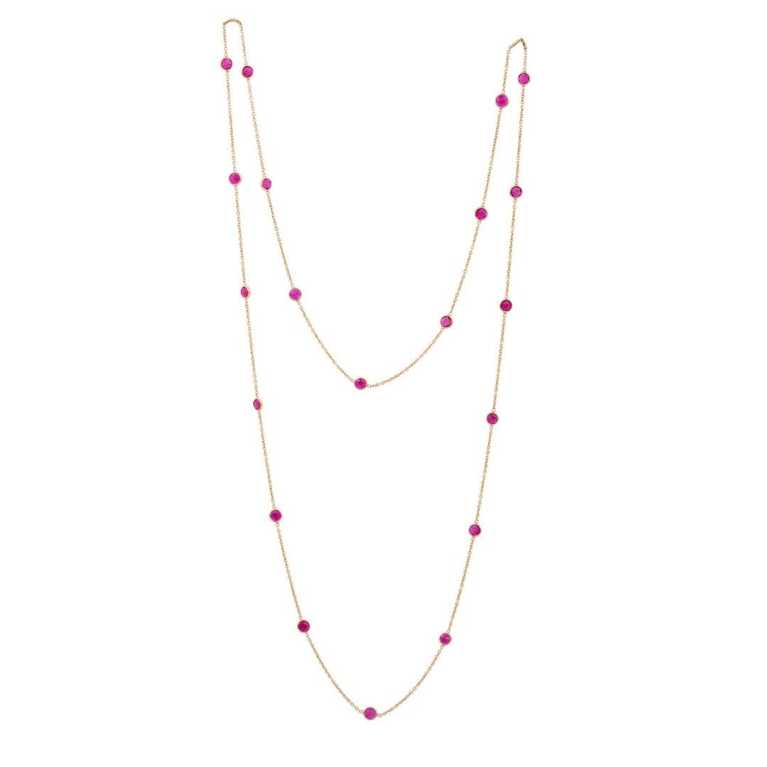 Crafted from 18k Solid Gold, this necklace features a stunning array of round-cut rubies, totaling 3.42 carats. Each ruby is delicately set in a bezel setting, showcasing their vibrant red hue and excellent clarity. The rubies measure 3.30 mm in diameter, creating a uniform and captivating display along the length of the necklace.