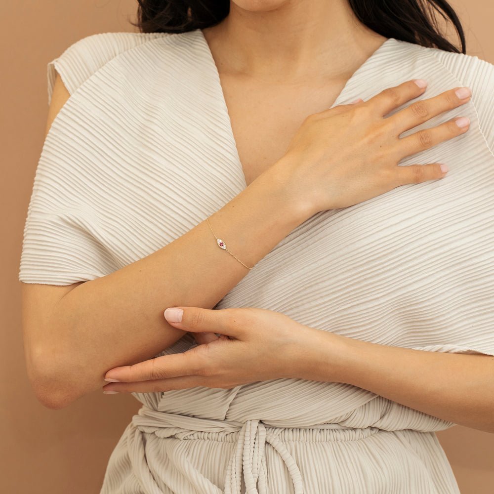 Add a touch of elegance and protection to your ensemble with our Ruby Eye Diamond Bracelet, a stunning piece that combines timeless style with symbolic significance. Handcrafted with care and attention to detail, this bracelet features an eye-catching evil eye charm, crafted from lustrous 18k Solid Gold.