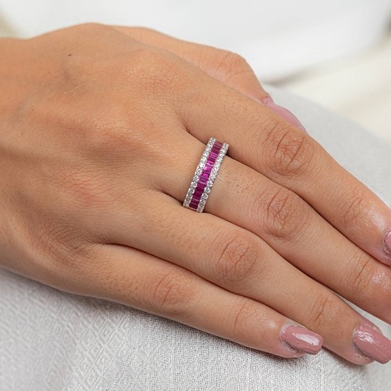 The ring is further adorned with 17 sparkling diamonds, with a combined weight of 0.46 carats. Each diamond, measuring 1.75 mm, adds a touch of sparkle and sophistication, perfectly complementing the vibrant rubies. The combination of baguette rubies and diamonds creates a harmonious design that captures the light beautifully and adds a touch of luxury to the piece.