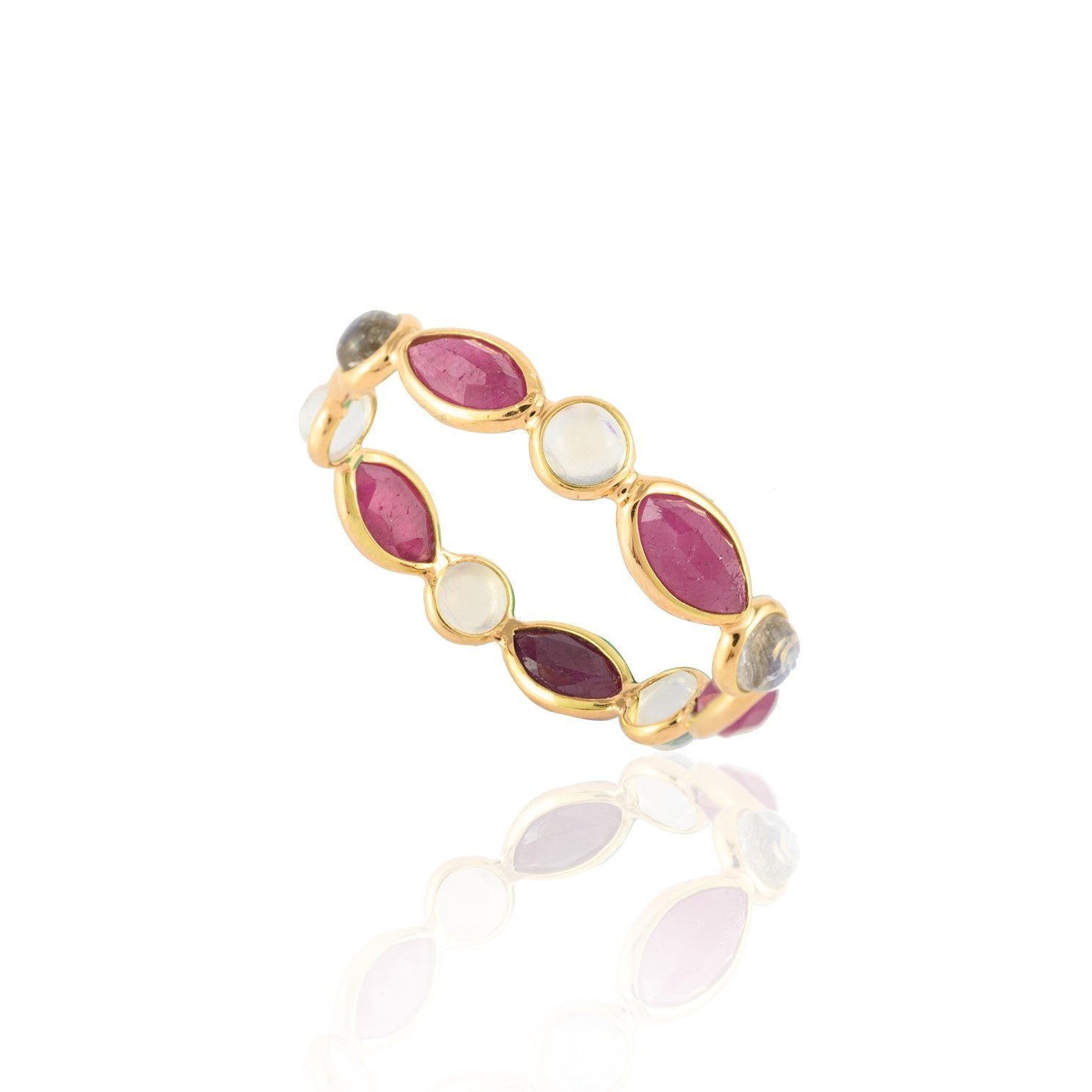 Chic 18k solid gold eternity band featuring alternating rubies and rainbow moonstones—crafted for vibrant elegance and mystical beauty.