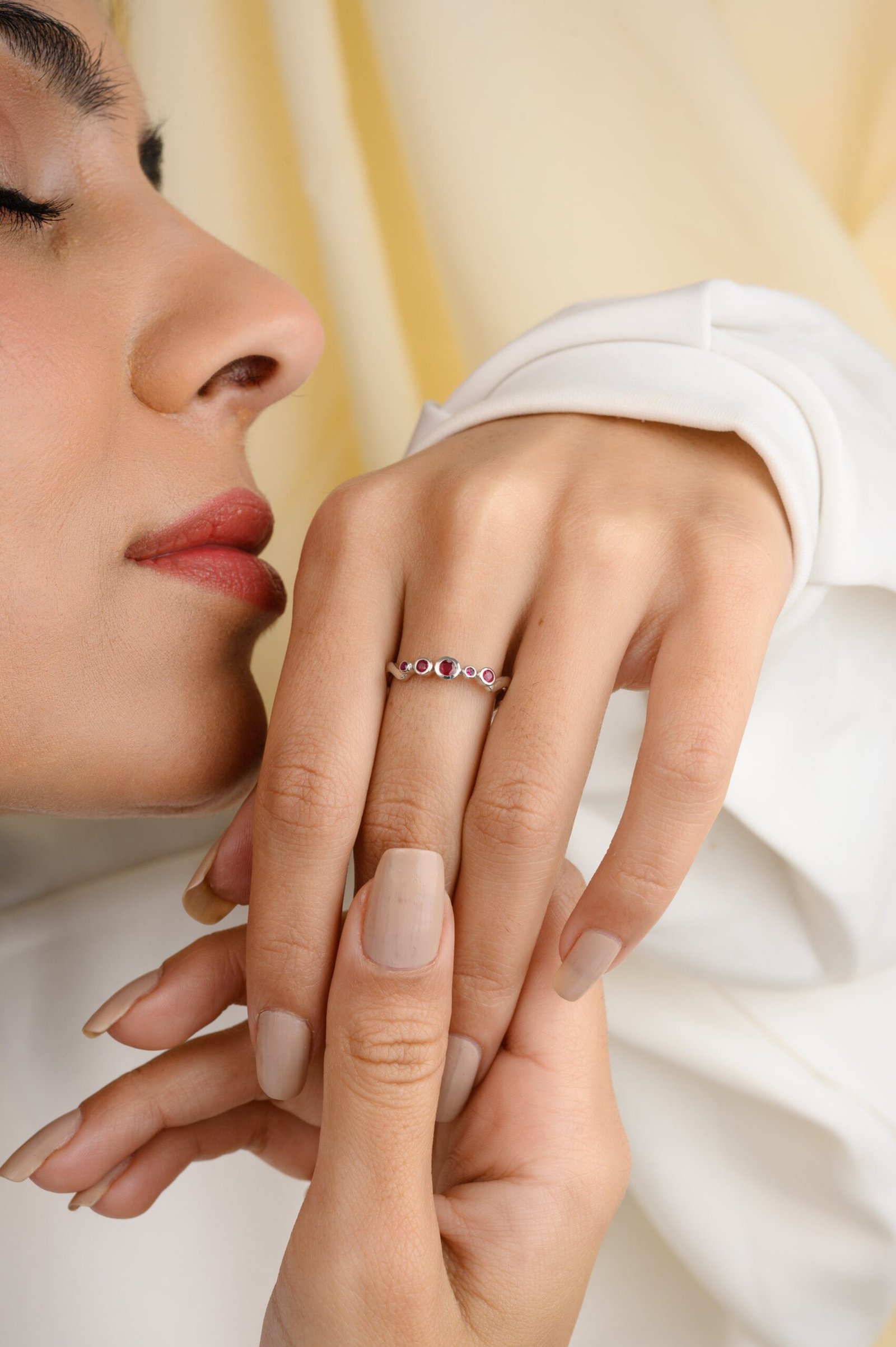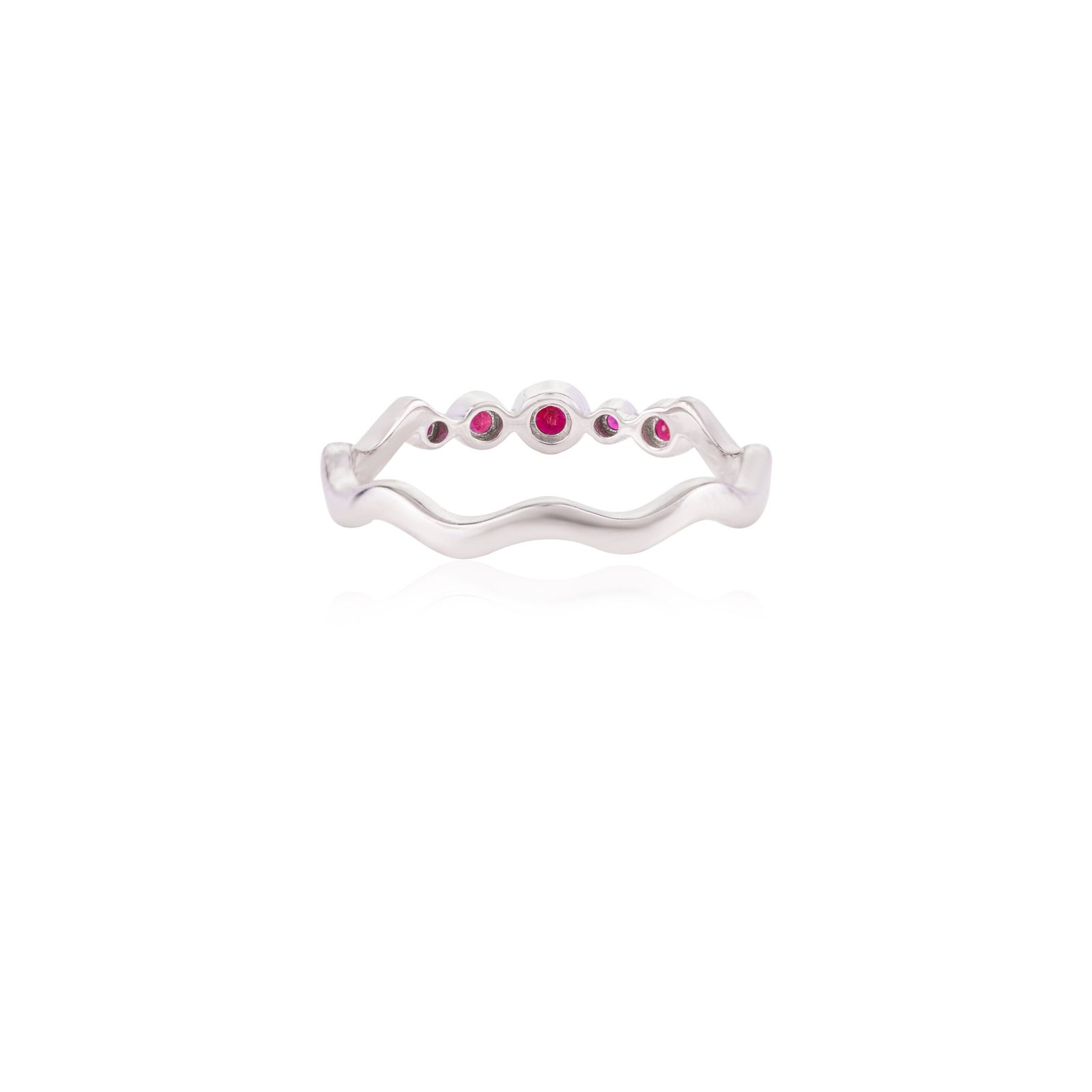 The 18k Solid Gold Ruby Wavy Dainty Ring is a stunning piece that combines the vibrant allure of rubies with the elegance of white gold. Crafted from 18k solid gold, this ring features five exquisite round rubies, with a total gemstone weight of 0.27 carats. The rubies, varying in sizes of 2.2 mm, 1.6 mm, and 1.2 mm, add a touch of color and sparkle to the ring.