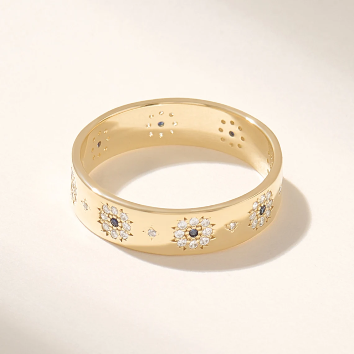 A delicate 18k solid gold band featuring vibrant sapphires in a floral design, offering a timeless and elegant addition to any jewelry collection.