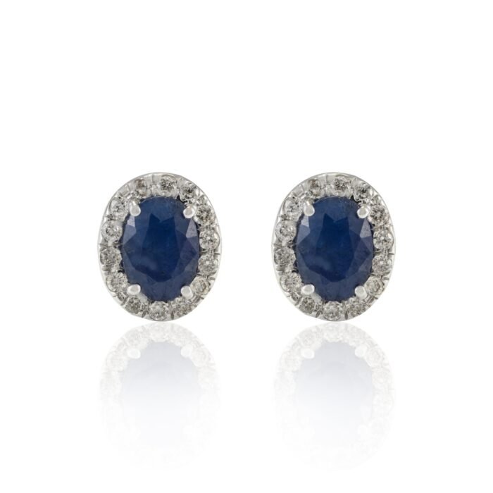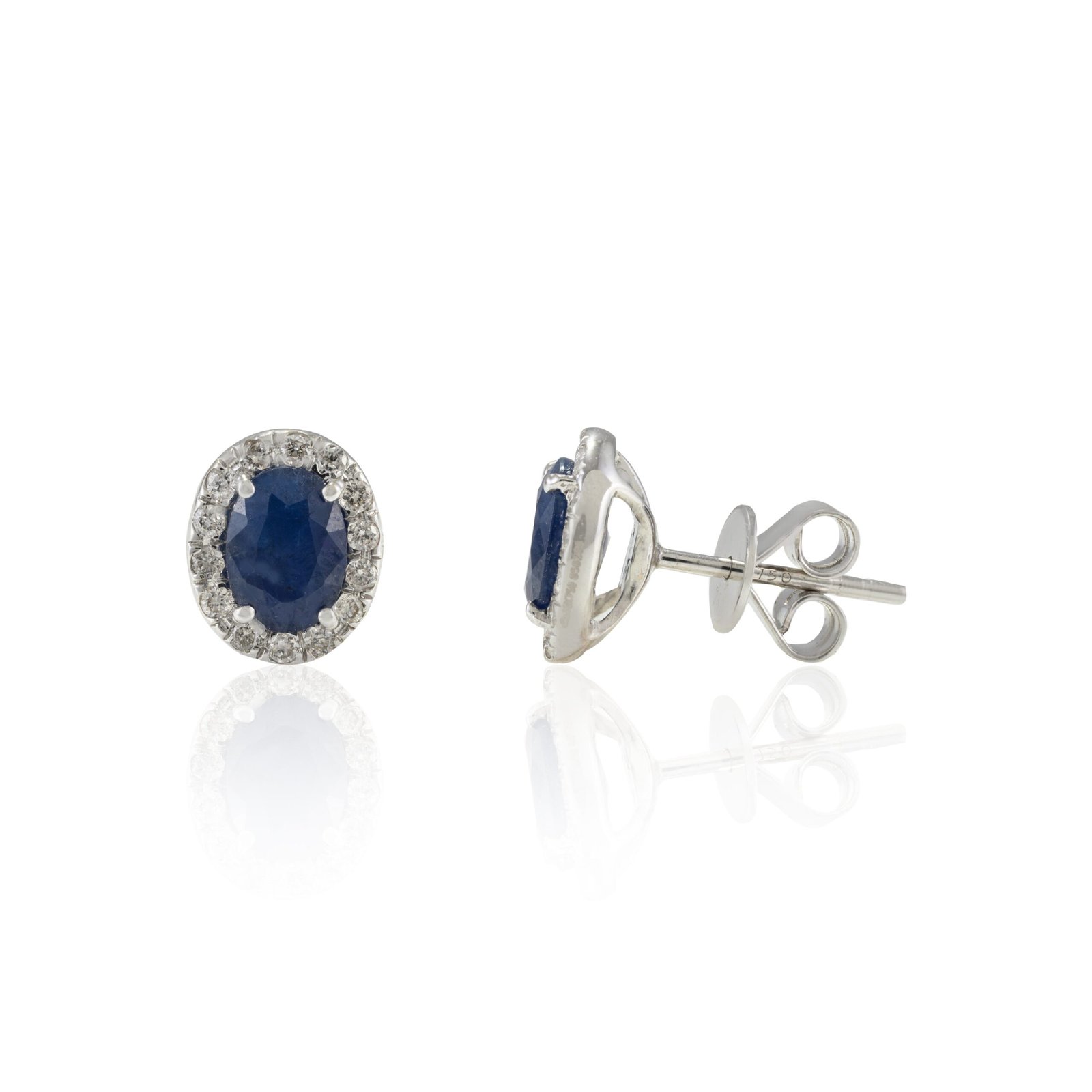 Weighing 3.14 grams, these stud earrings offer a substantial yet comfortable feel, making them ideal for everyday wear or special occasions. The elegant design ensures that the sapphires and diamonds remain the focal points, allowing their beauty to shine through. The prong and halo settings provide a secure and stylish way to showcase the gemstones, enhancing the overall appeal of the studs.