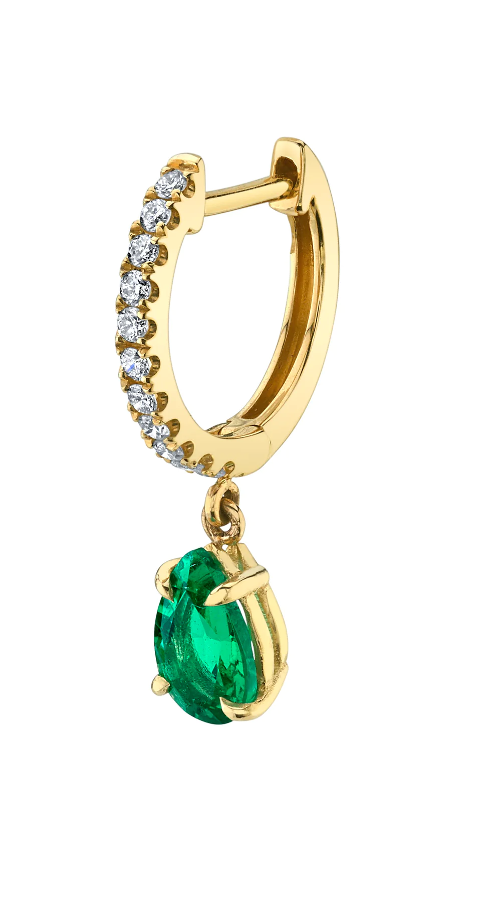 18k Solid Gold Single Diamond Huggie With Pear-Shaped Emerald Drop