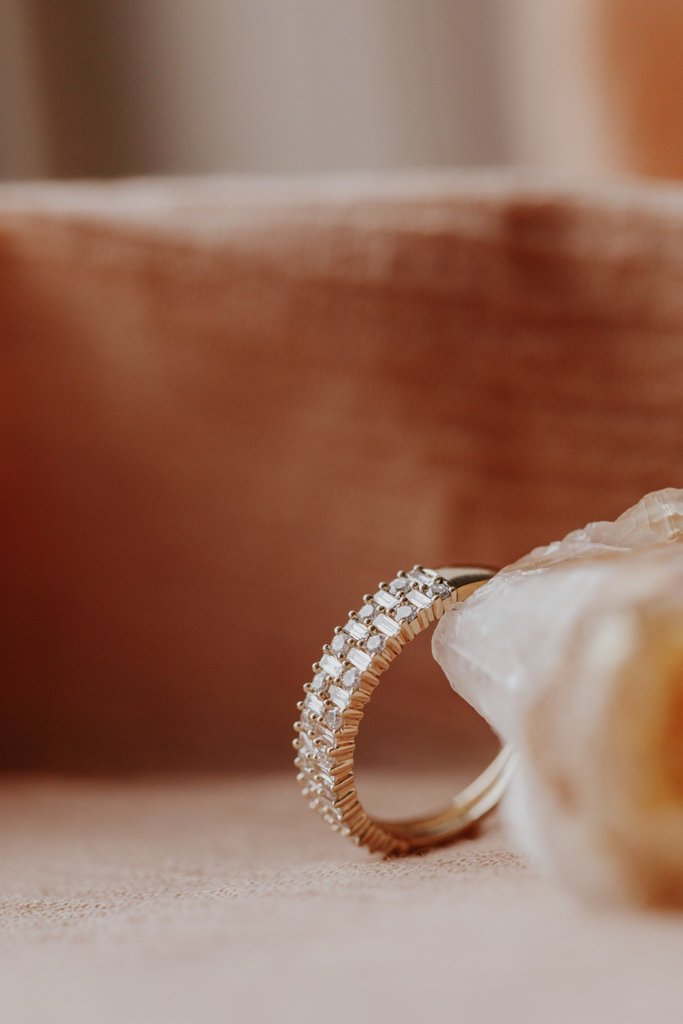 14K gold ring with a 0.13 ctw baguette-cut diamond (GH/VS-SI), set on a 1.3 mm band. Minimalist, stackable, BIS hallmarked & GIA certified.
