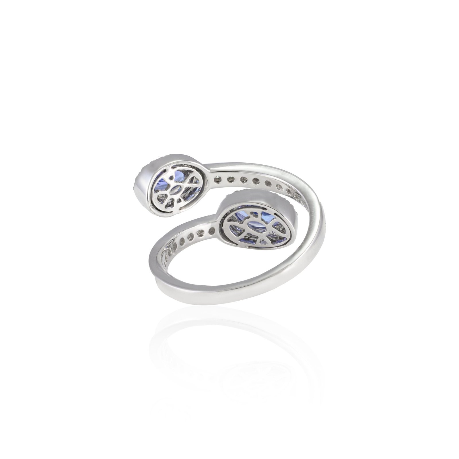 The tanzanite are perfectly complemented by 59 brilliant-cut diamonds, totaling 0.53 carats. These diamonds are carefully set in a prong setting to maximize their sparkle and are arranged in a delicate bypass design that elegantly wraps around the finger. Each diamond, measuring 1 mm in size, is hand-selected for its exceptional clarity and color, ensuring a breathtaking display of brilliance.