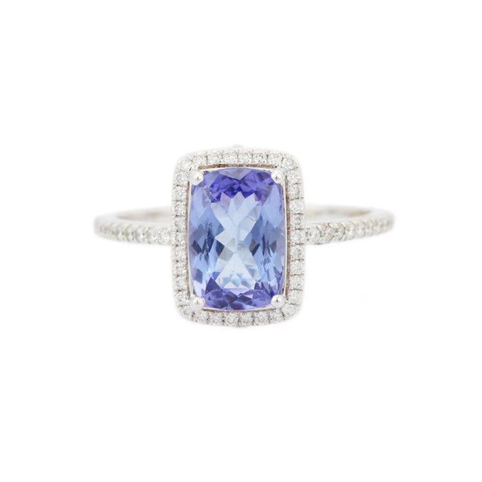 The 18k Solid Gold Tanzanite Ring is a masterful blend of elegance and sophistication, perfect for those who appreciate fine jewelry. Crafted from 18k solid gold, this ring provides a sleek and modern backdrop for its stunning gemstones. The centerpiece of the ring is a magnificent 1.76 carat cushion-cut tanzanite, known for its rich, vibrant blue-purple hue. This gemstone, measuring 9 x 6 mm, is carefully selected for its exceptional color and clarity, ensuring it stands out beautifully.