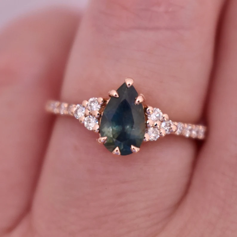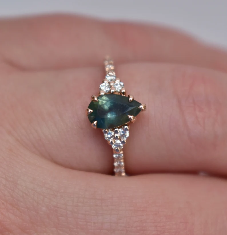 - Main Stone: Natural Teal Green Sapphire (Approx. 1.2-1.4 ct)