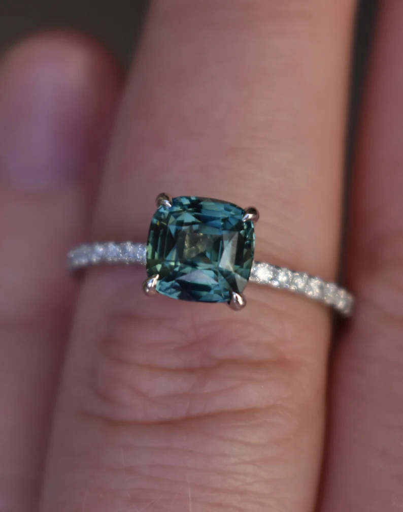 Make a statement of elegance and uniqueness with our 18k Solid Gold Teal Sapphire Hidden Halo Diamond Engagement Ring. Featuring a mesmerizing 2-2.10 carat natural teal sapphire, this ring captures the beauty of deep blue-green hues, symbolizing wisdom, loyalty, and eternal love. Each sapphire is unique—contact us for similar gemstone options to find the perfect match for your love story.