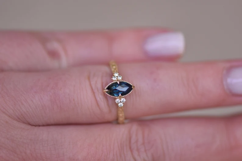 18K Solid Gold Teal Sapphire Marquise Engagement Ring