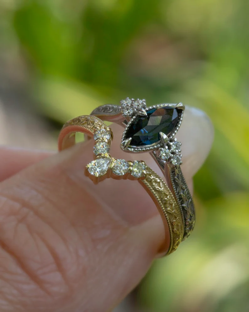 Romantic 18k solid gold engagement ring featuring a marquise-cut teal sapphire—crafted for timeless elegance and bold, modern charm.