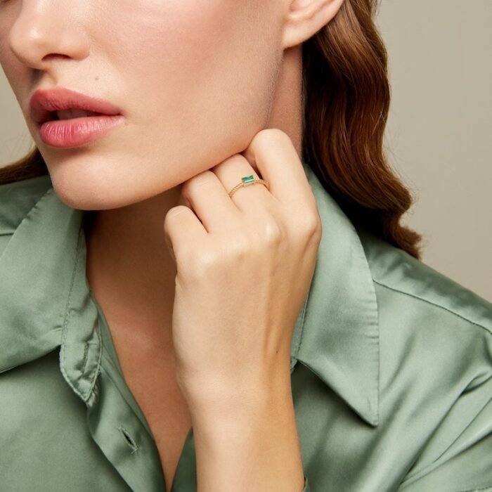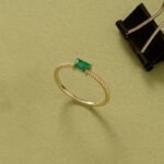 Graceful 18k solid gold ring featuring twined bands accented with a vibrant emerald—crafted for natural elegance and modern sophistication.