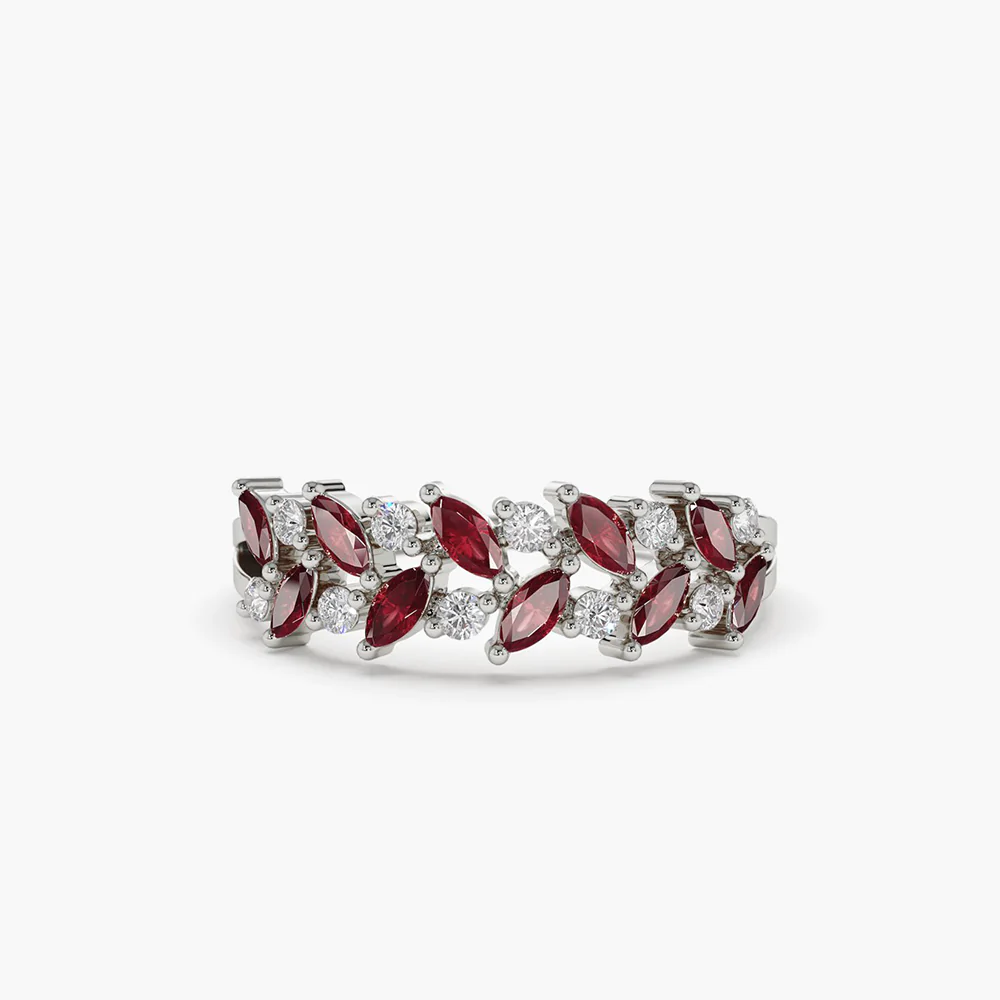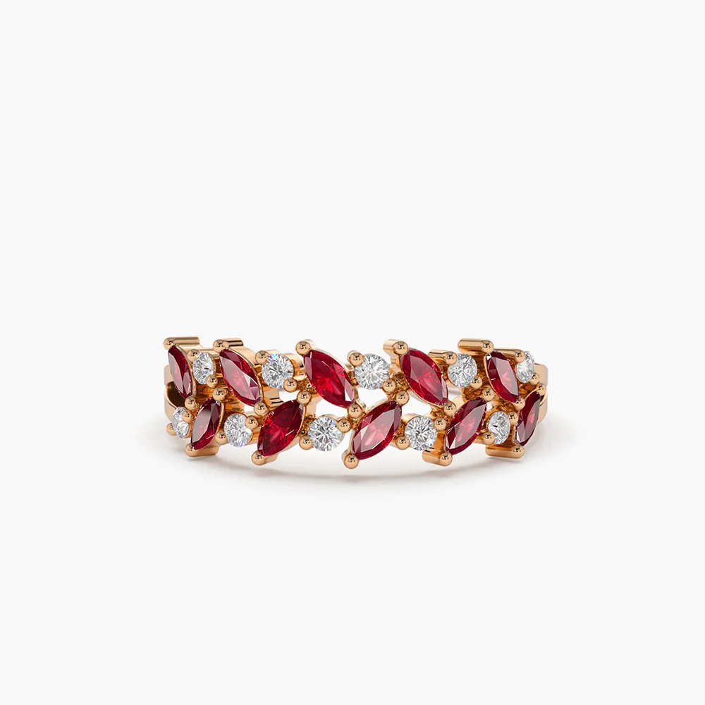 Stunning 18k solid gold ring with two rows of marquise-cut natural rubies and diamonds—crafted for bold elegance and timeless sophistication.