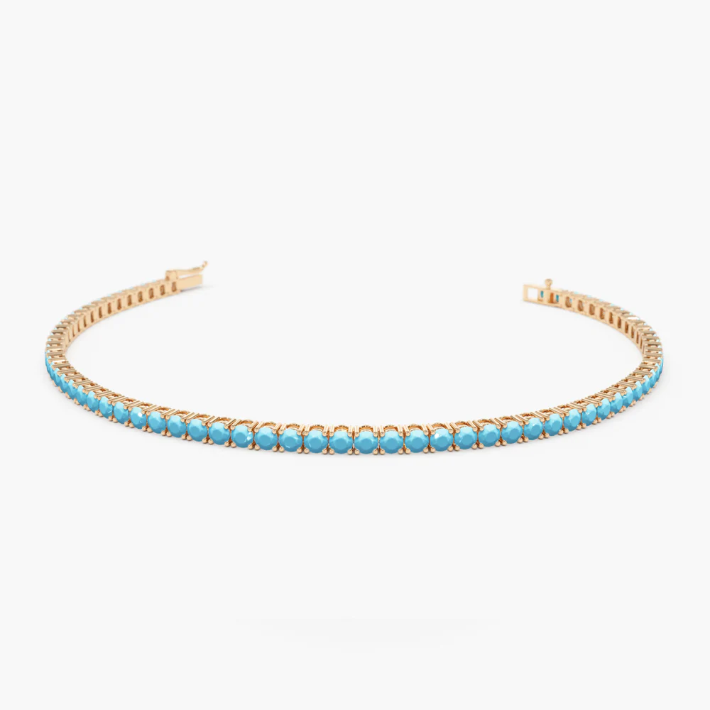 A vibrant 18k solid gold tennis bracelet featuring turquoise stones in a prong setting, offering a chic and elegant design perfect for any occasion.
