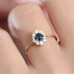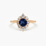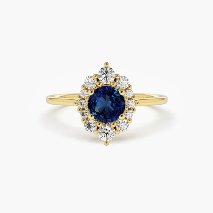 Timeless 18k solid gold engagement ring featuring a round sapphire surrounded by a diamond halo—crafted for brilliance and classic romance.