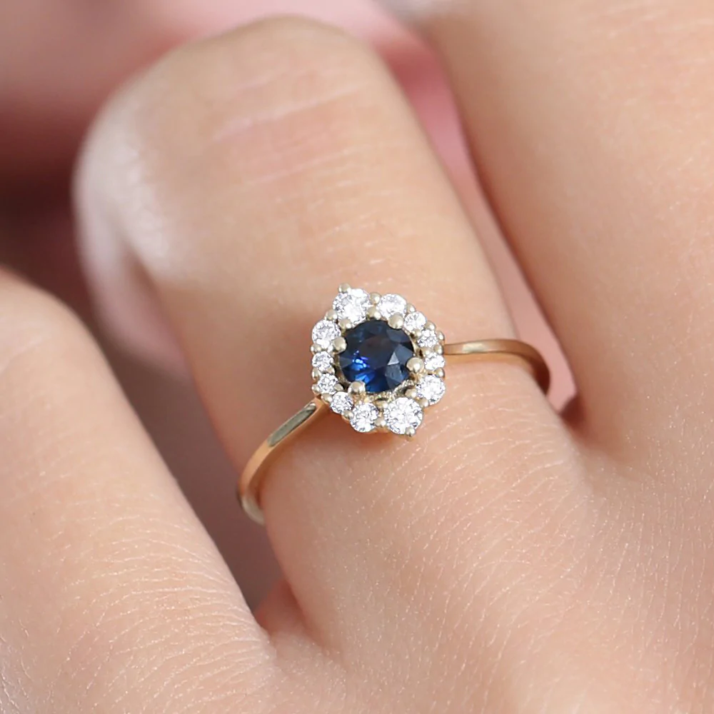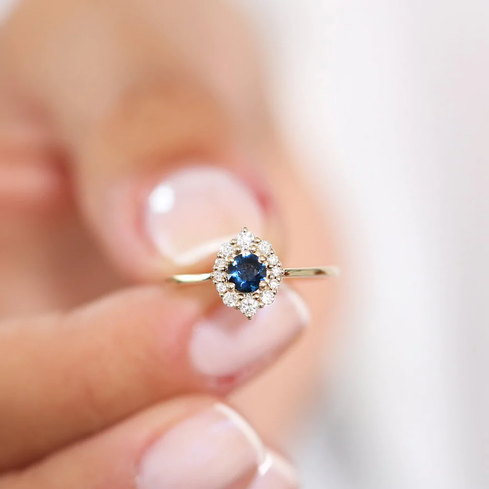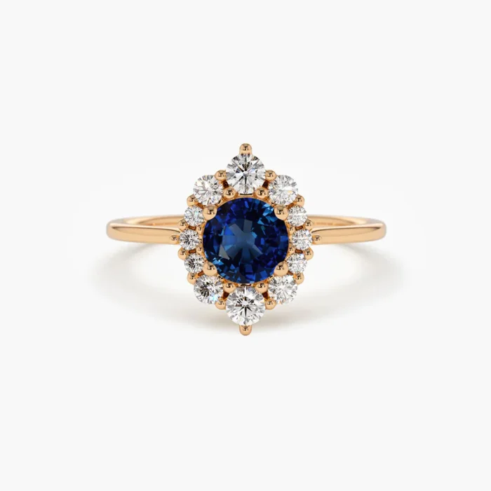 18k Solid Round Sapphire Halo Diamond Engagement Ring