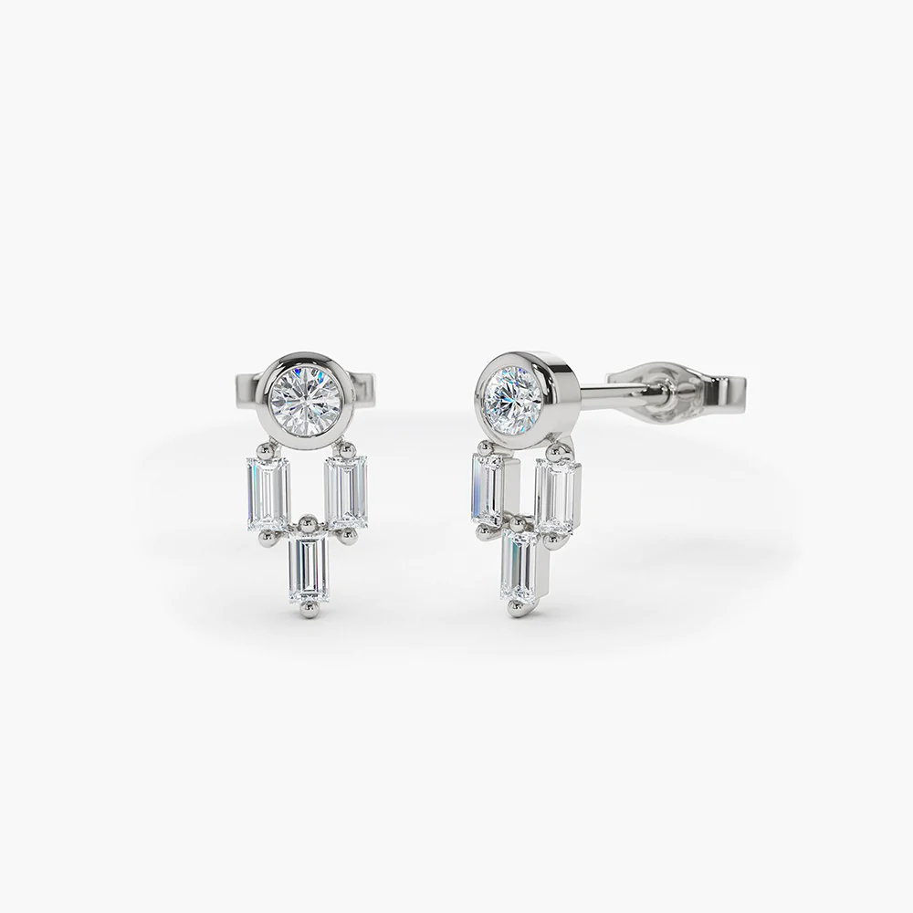The earrings are in a unique combination of baguette and round Natural diamonds, comprising a total of eight handpicked stones. Six baguette diamonds, each measuring 2.50 x 1.50 mm, give a sleek linear pattern, while two round diamonds of 2.5 mm add sparkle and sophistication. These earrings carry a total carat weight of 0.32 ct, exuding luxury and style.