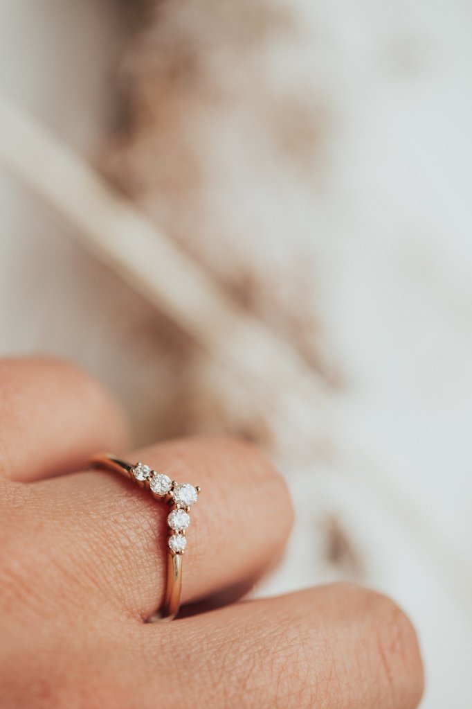 The diamonds are of GH COLOR and VS-SI Clarity, selected for their exceptional sparkle and clean brilliance. Their placement at the tip of the V creates a focal point of light, adding a subtle yet striking detail to the overall look.