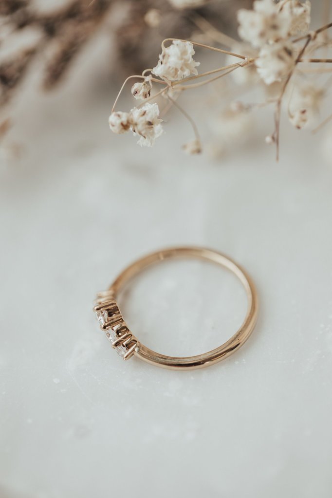 14K solid gold fluted diamond wedding band with 0.08 ctw GH/VS-SI natural diamond. Unique textured design in yellow, white, or rose gold.