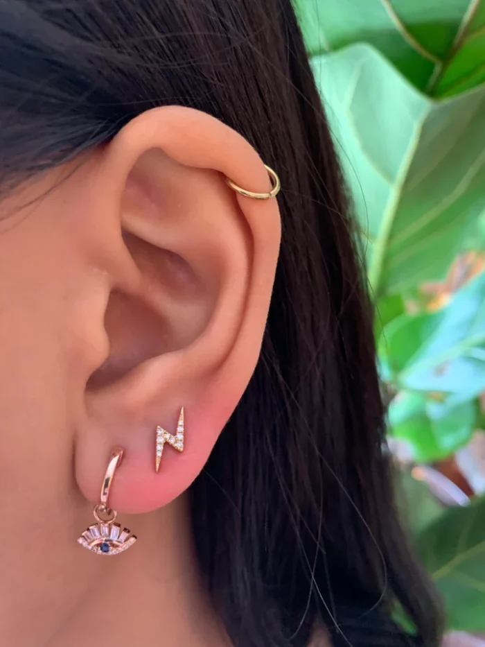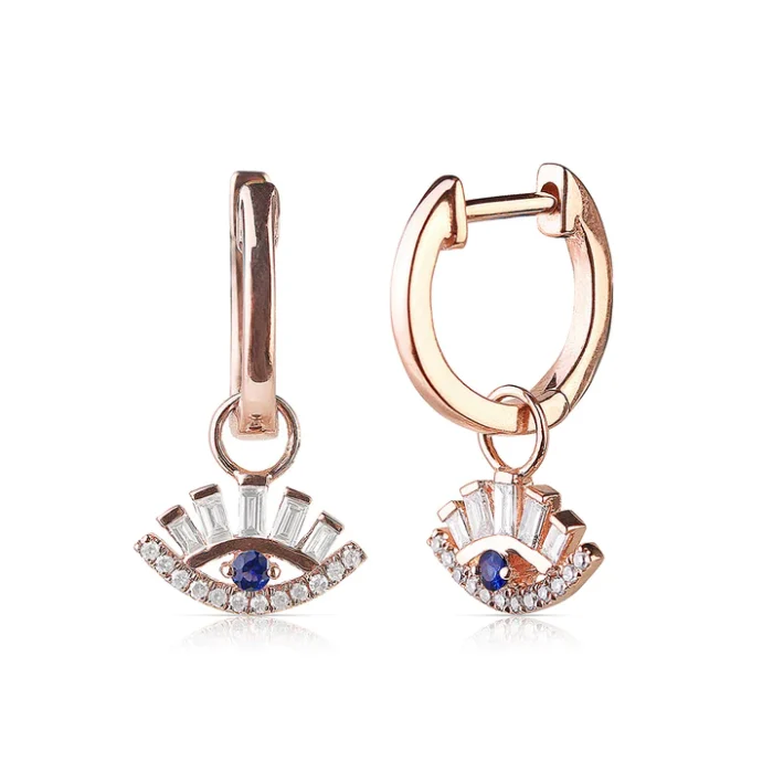 Stylish 14K solid gold charm earrings featuring baguette diamonds in an evil eye design—crafted for protection, sparkle, and modern elegance.