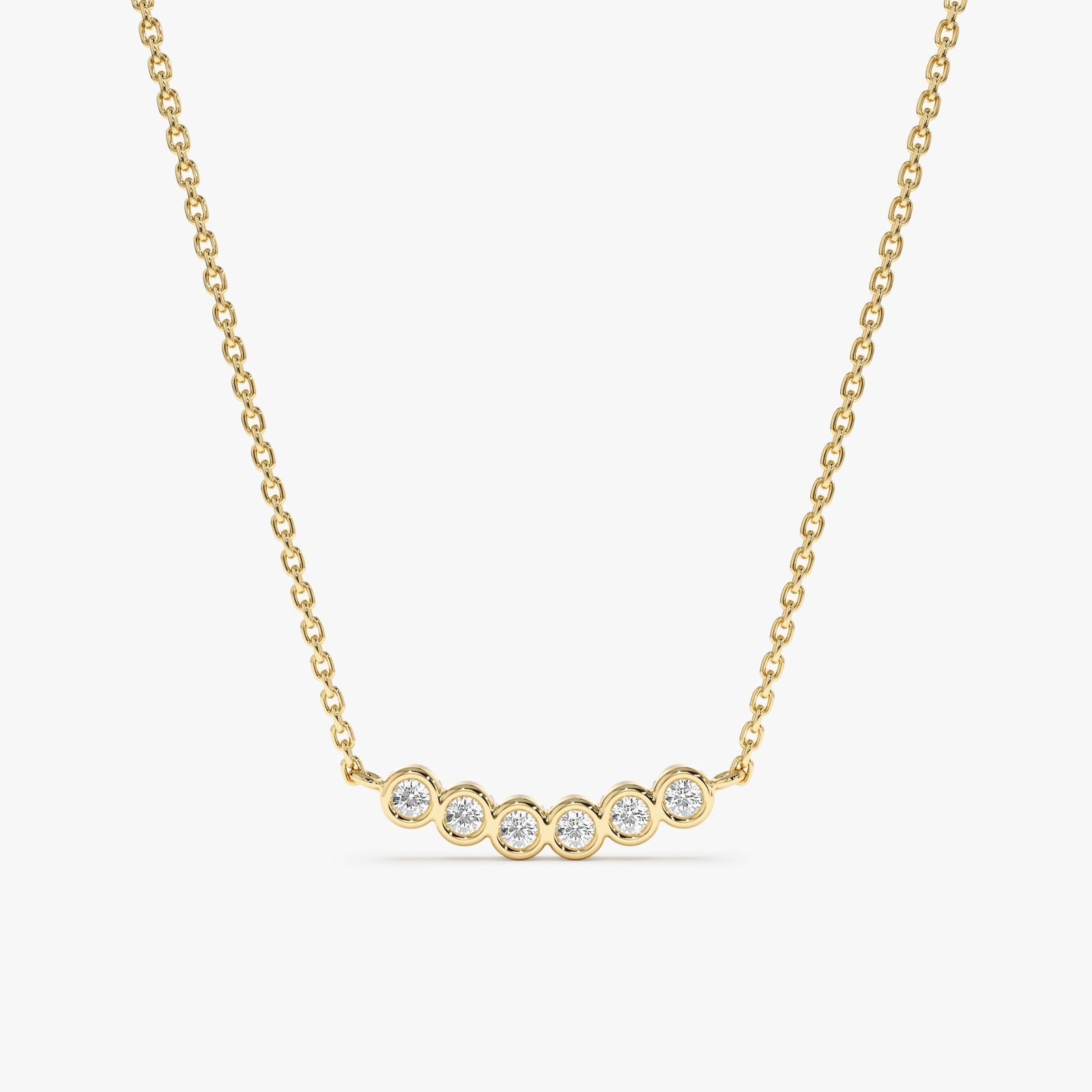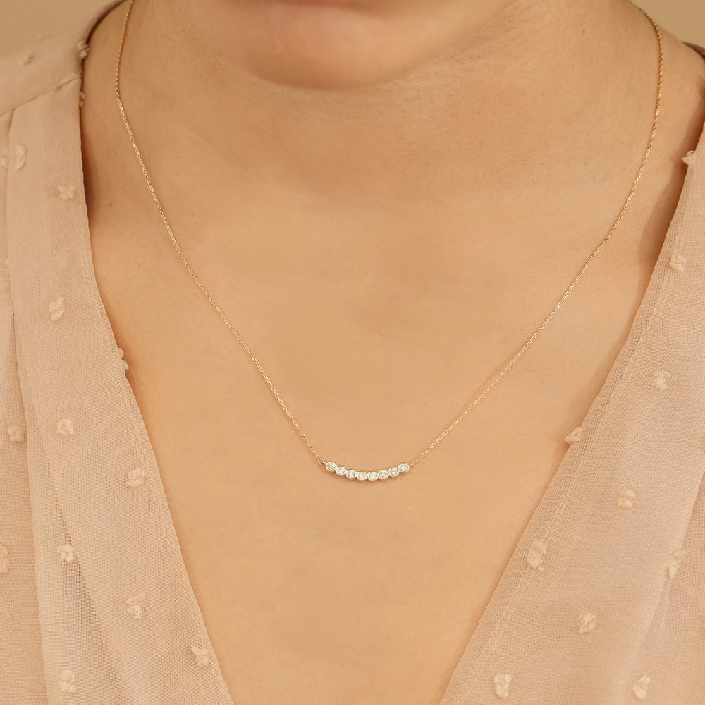 Elevate your elegance with the Curved Bubble Bar Diamond Necklace. Handcrafted in solid gold, it features sparkling diamonds in bezel settings, available in 6, 8, or 10-bezel designs.