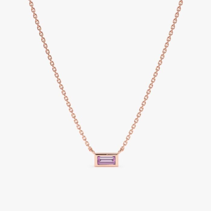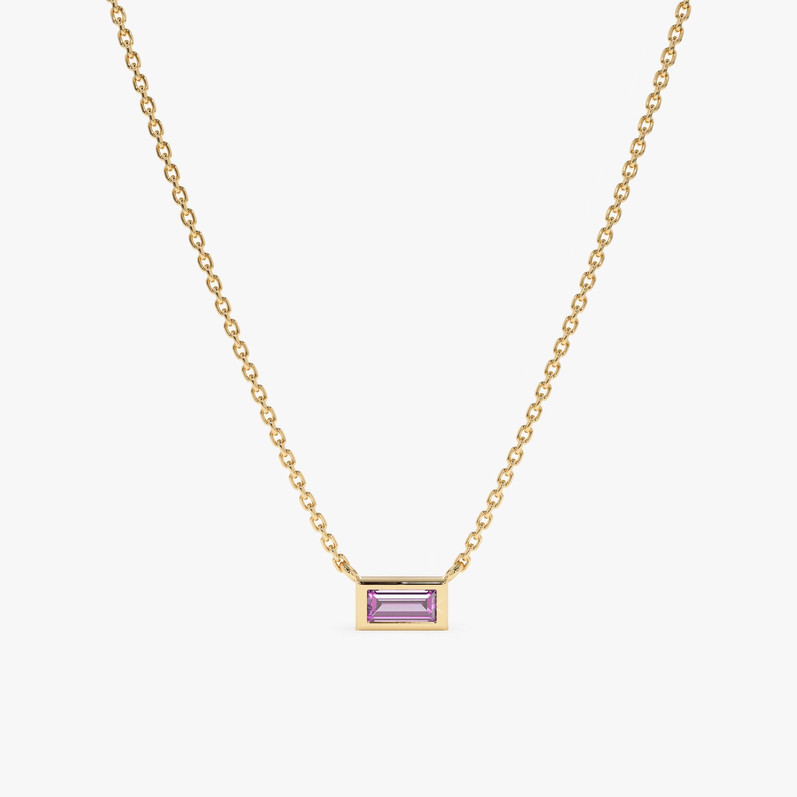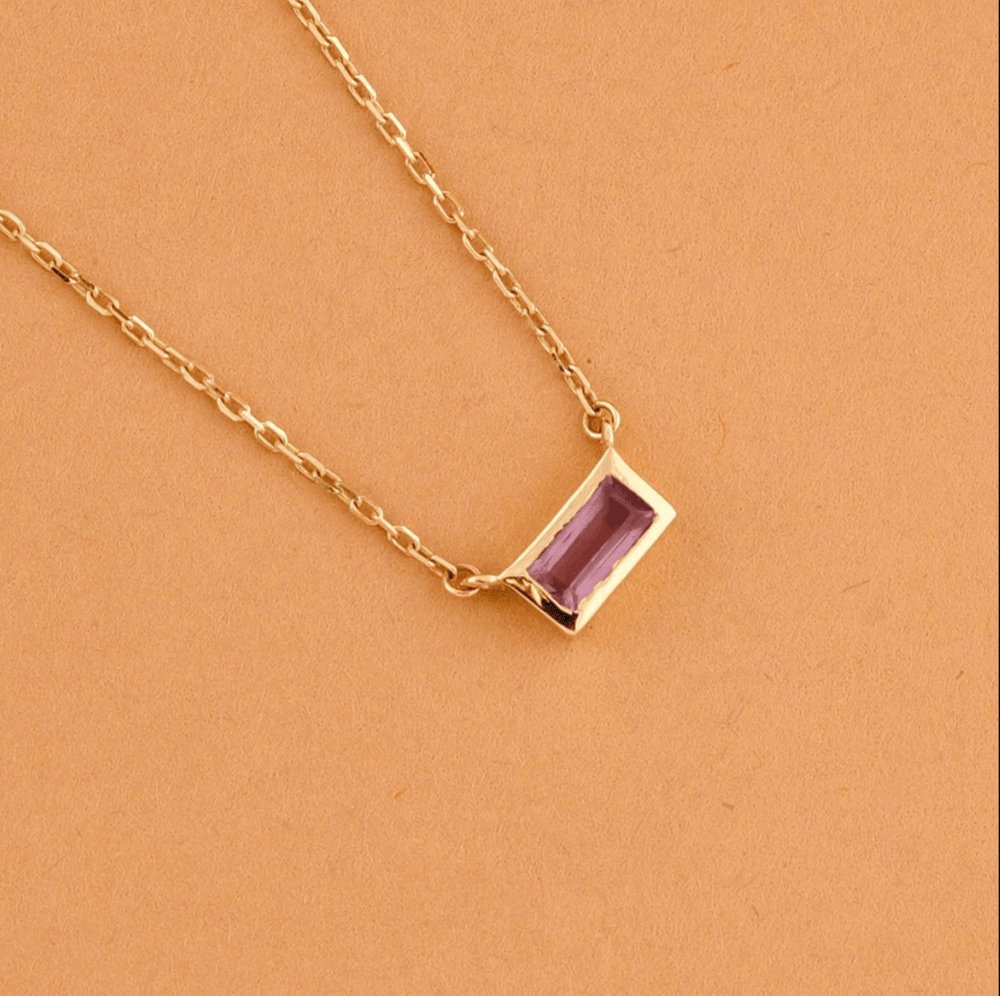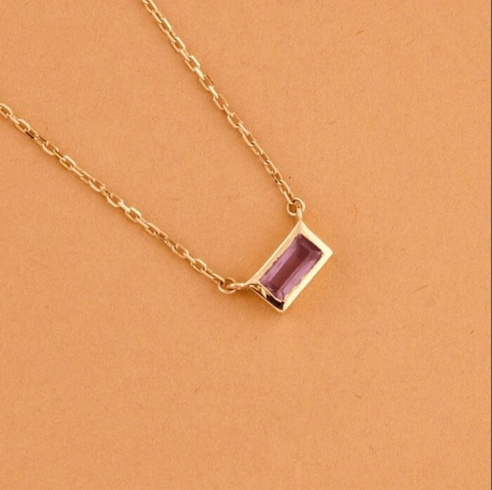 At the center of this charming necklace lies a single genuine amethyst gemstone, shimmering with deep purple hues reminiscent of a mesmerizing sunset. Set within a delicate bezel crafted from solid gold, available in yellow, white, or rose gold, the amethyst exudes a sense of serenity and balance, adding a touch of elegance to any ensemble.