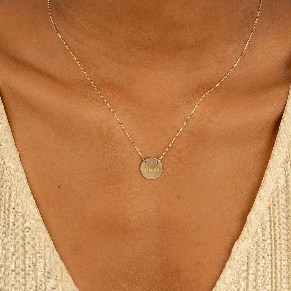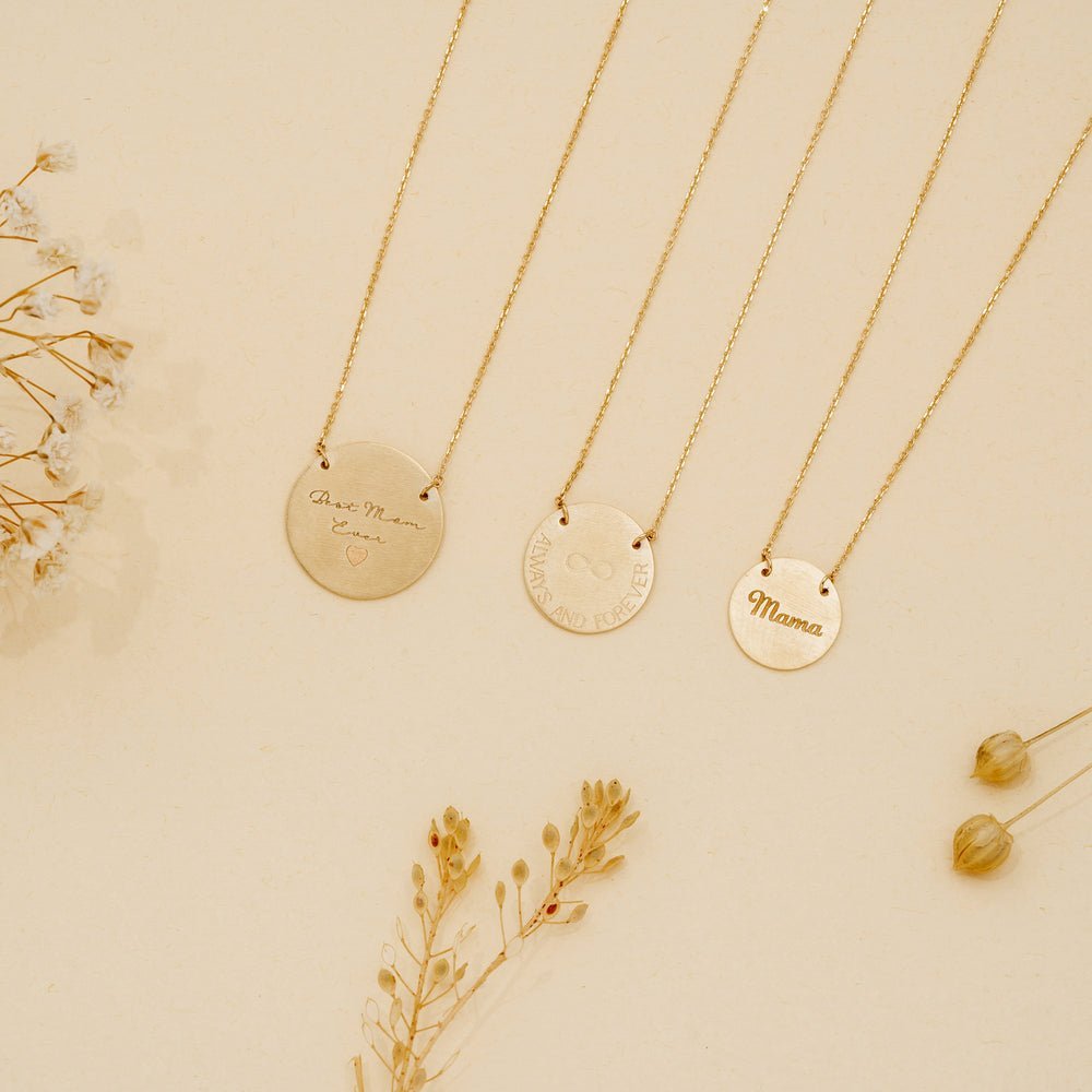 The brushed finish adds a touch of modern sophistication to the necklace, enhancing its understated elegance and versatility. The smooth and sleek disc provides the perfect backdrop for your chosen engraving, ensuring that your personalization stands out beautifully against the radiant gold surface.