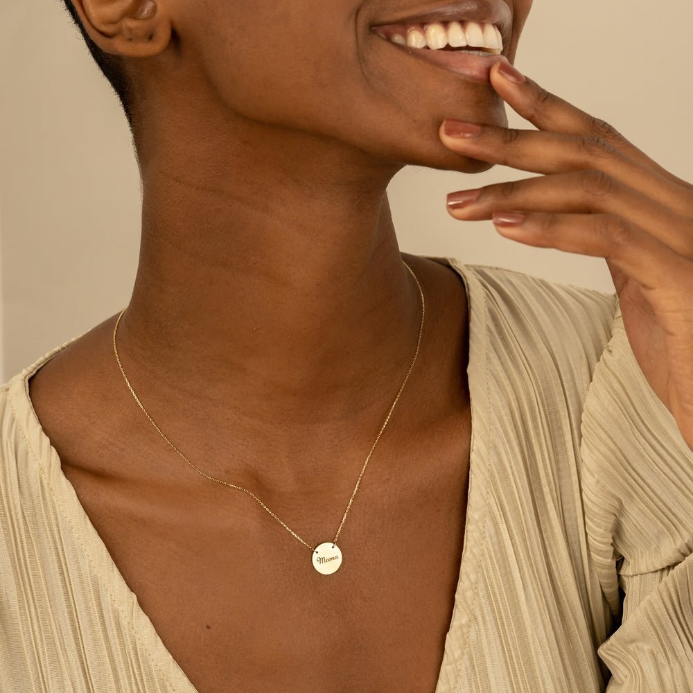 Handmade with care and precision, this necklace exudes quality and craftsmanship, making it a cherished piece in your jewelry collection for years to come. The dimensions of the disc pendant measure 13mm (1/2 inch), striking the perfect balance between dainty charm and subtle statement.