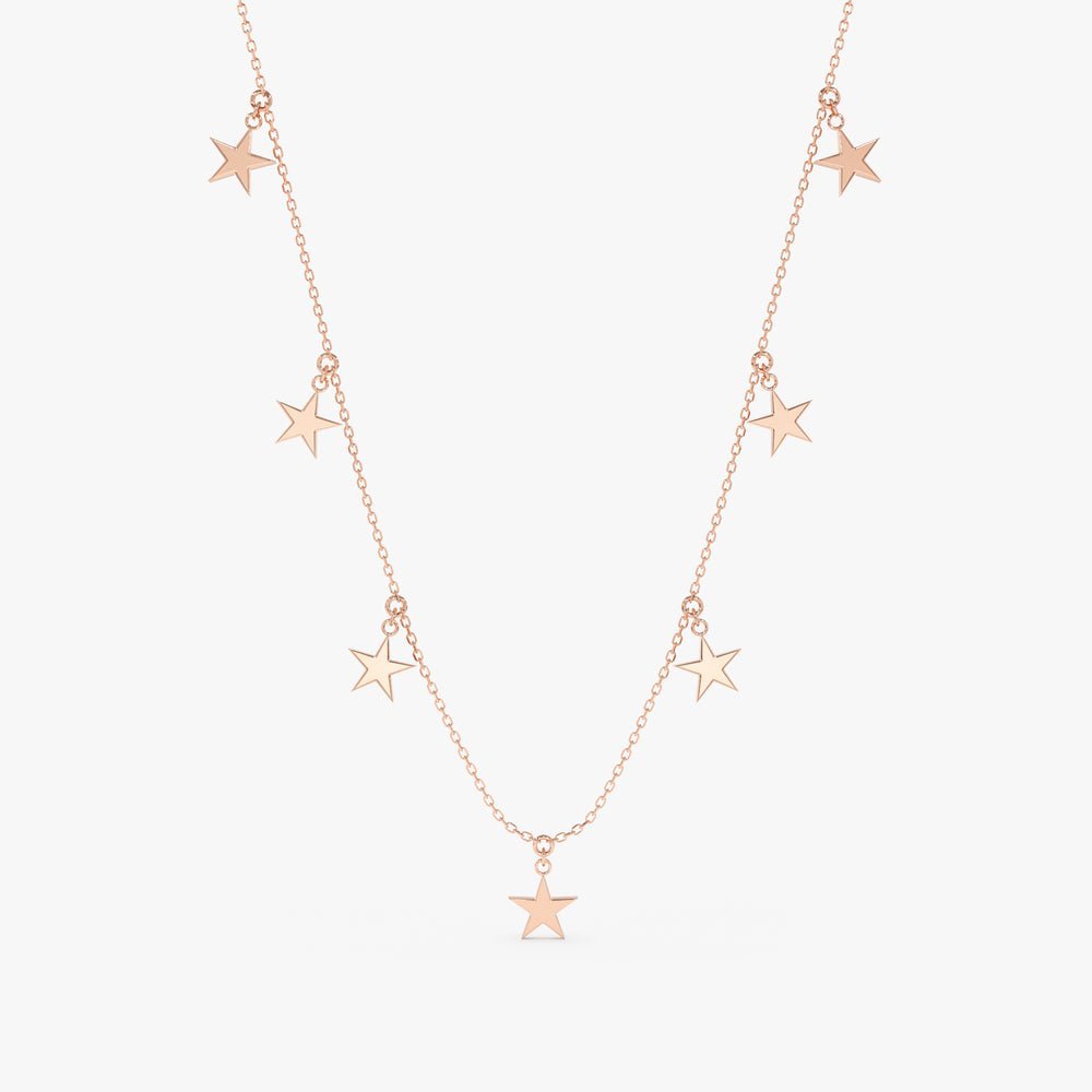 Measuring 5mm in size, each star charm adds a subtle yet impactful touch to the necklace, creating a captivating visual display that captures the imagination. Whether worn alone as a statement piece or layered with other necklaces for a personalized look, this necklace is sure to become a cherished addition to your jewelry collection.