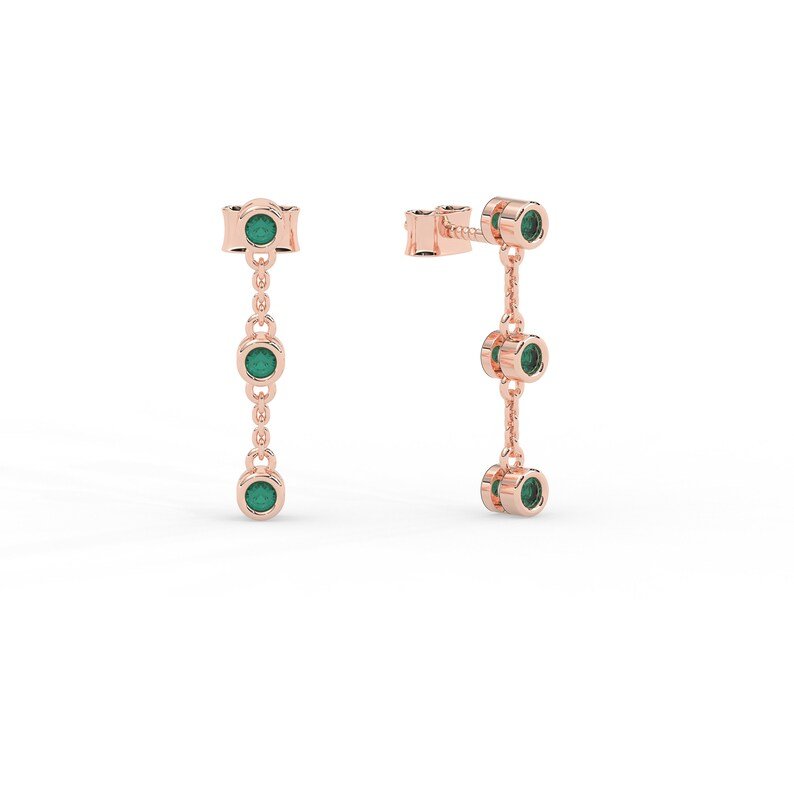 Elegant 14K solid gold dangle drop earrings featuring vibrant emeralds—designed for graceful movement and timeless sophistication.