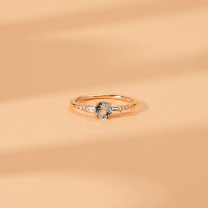 The diamond and aquamarine engagement ring is both vibrant and elegant, with the aquamarine adding a pop of color.
